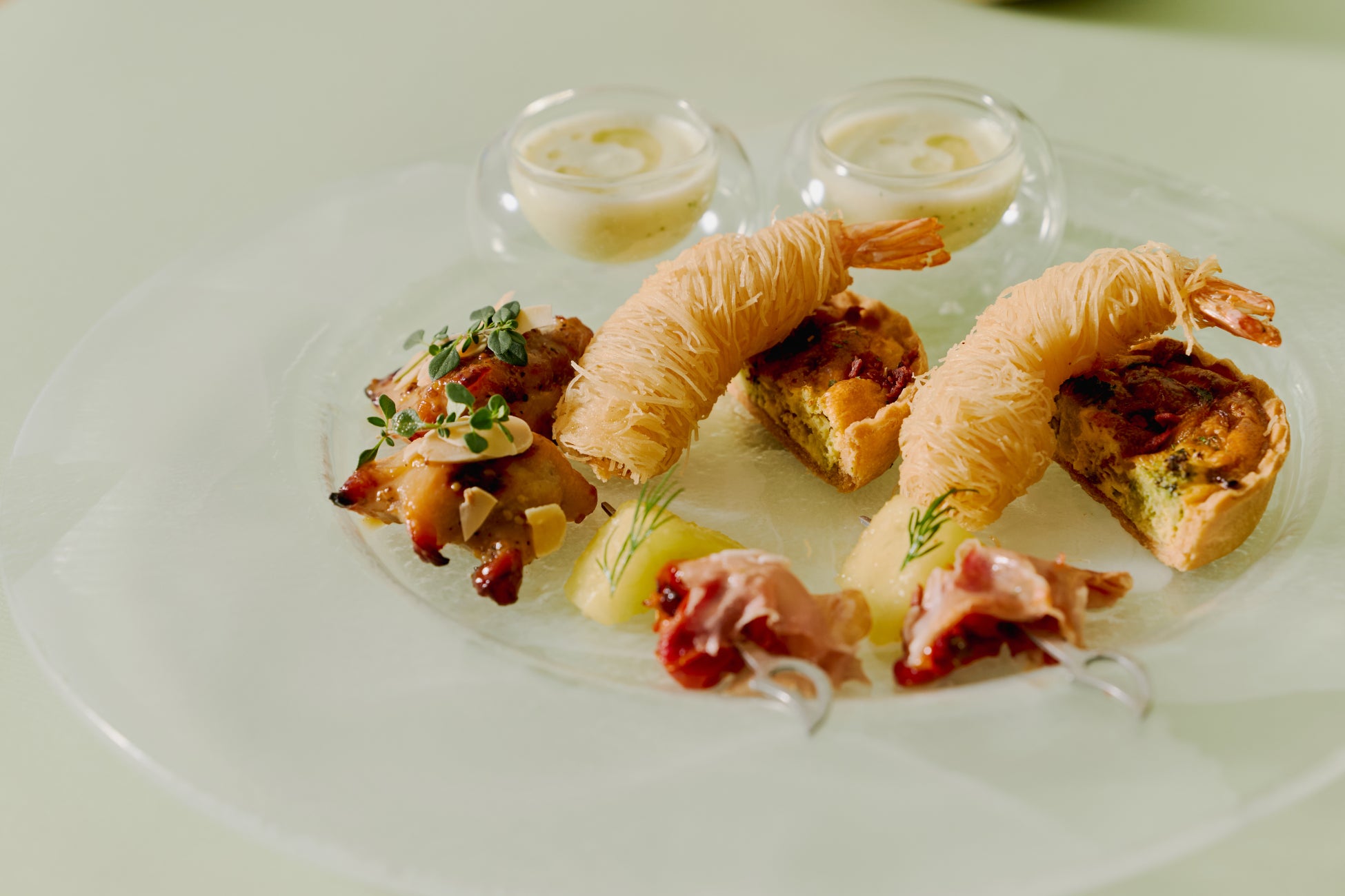 ぷりっとした大ぶりの海老に、トルコの伝統的な細麺状の衣「カダイフ」を丁寧に巻き付けて香ばしく揚げました。