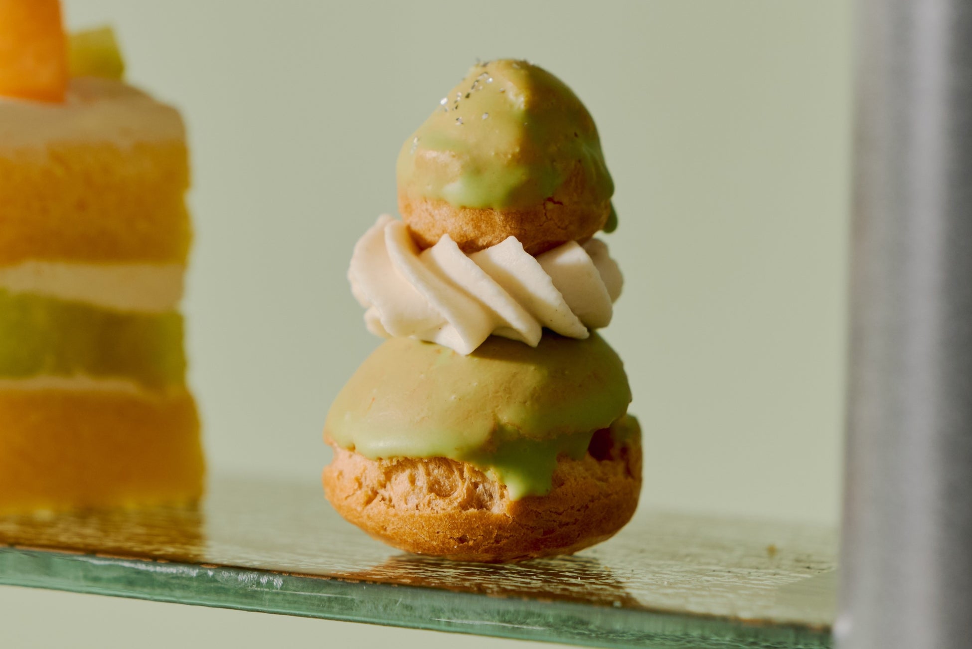 フランスの伝統菓子「ルリジューズ」をメロン仕立てに。大小重ねた可愛らしいシュー生地の中には、滑らかなメロンカスタードを詰め込みました。