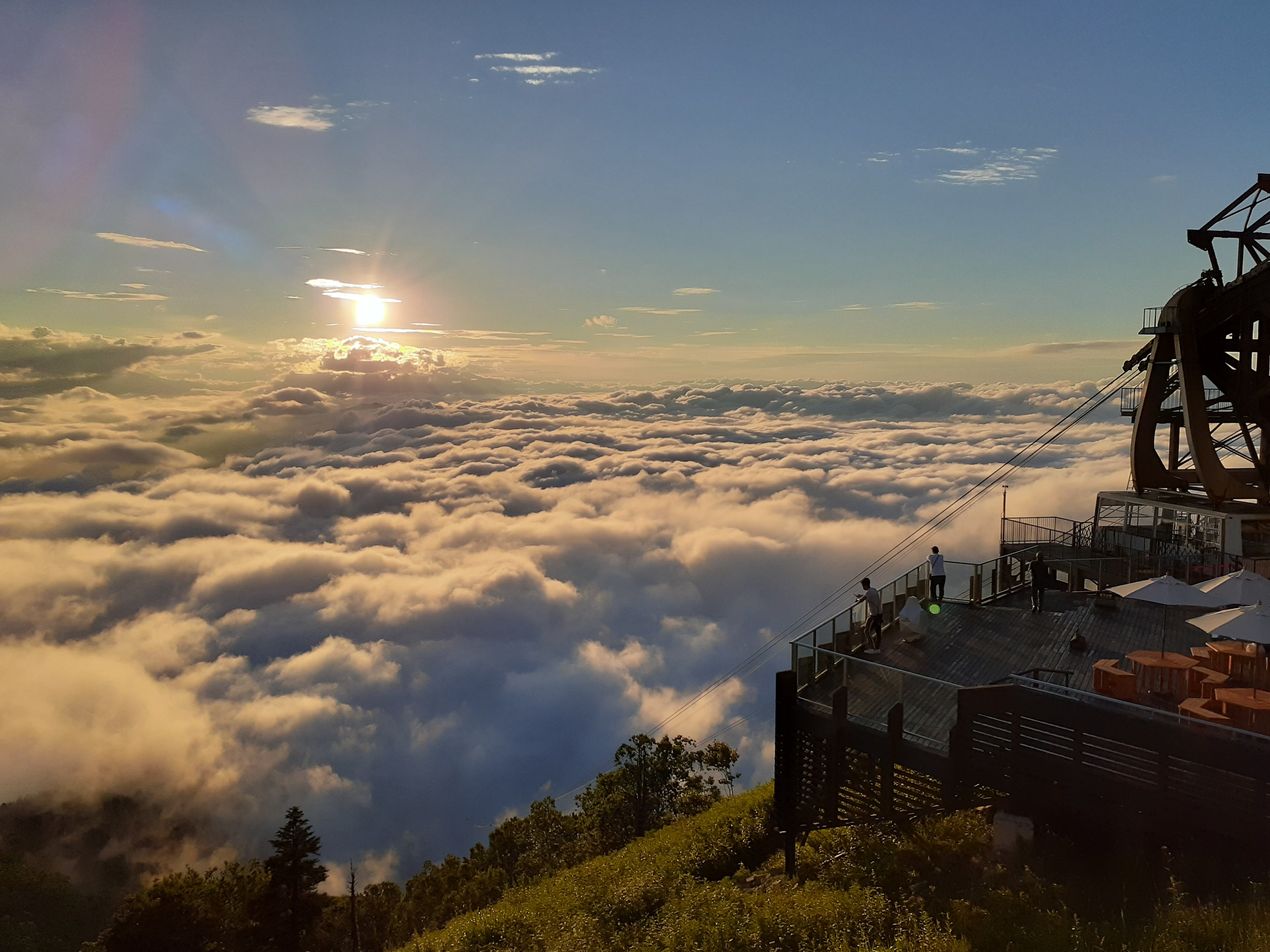雲海は早朝に発生するイメージがありますが、SORA terraceでは夕方に雲海が発生する確率が最も高く、目の前に沈むオレンジ色の夕日に照らされた雲海が見られるスポットとなります。