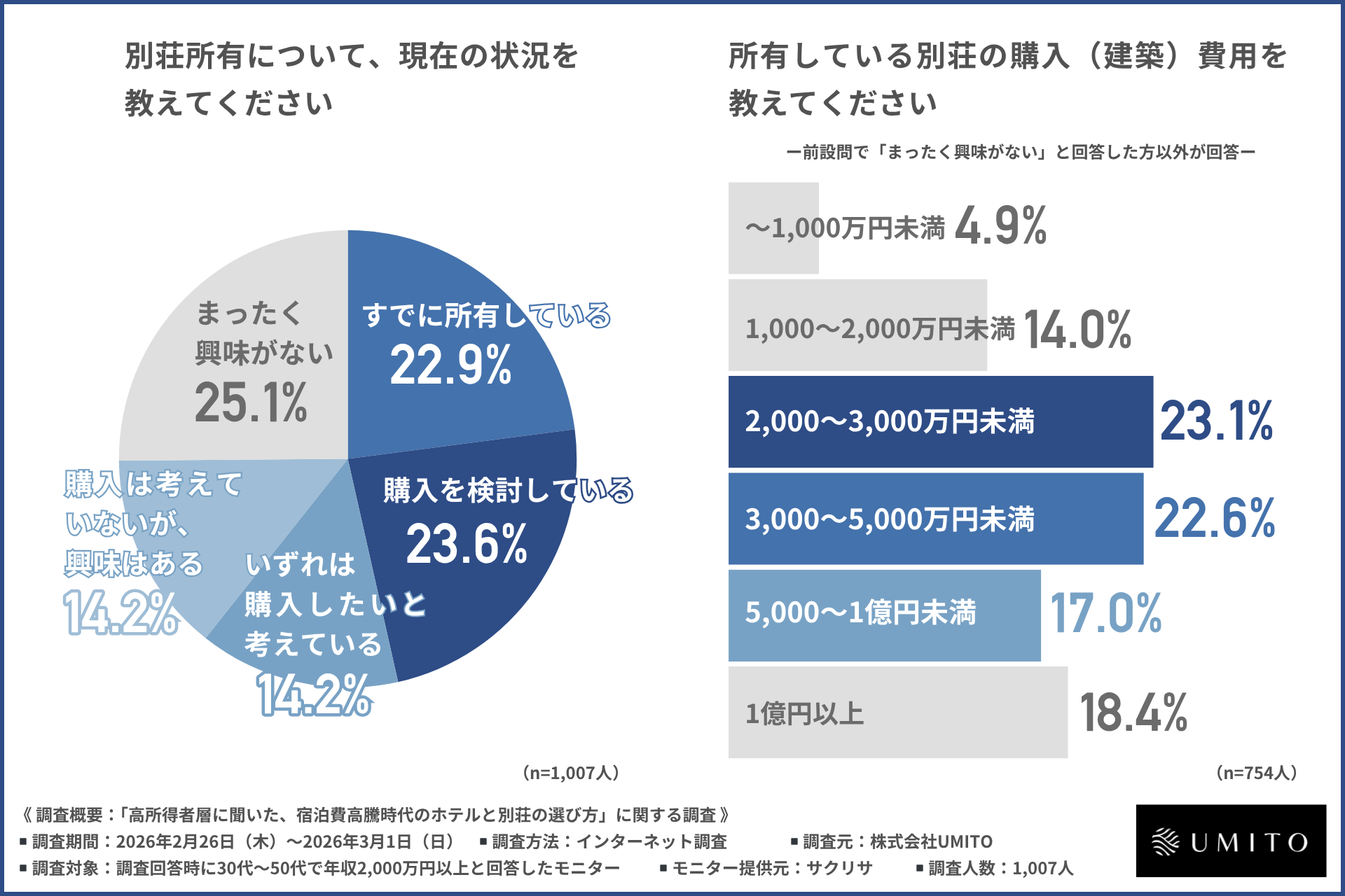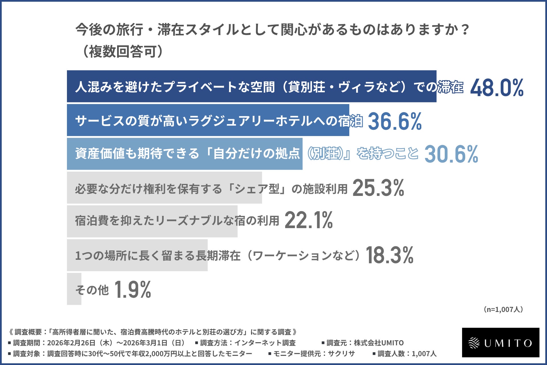 株式会社UMITO(所在地:東京都千代田区、代表取締役:堀 鉄平)は、30代~50代の年収2,000万円以上の約1,000名を対象に、ホテルと別荘の選び方に関する調査を行いましたので、その結果を以下にお知らせします。