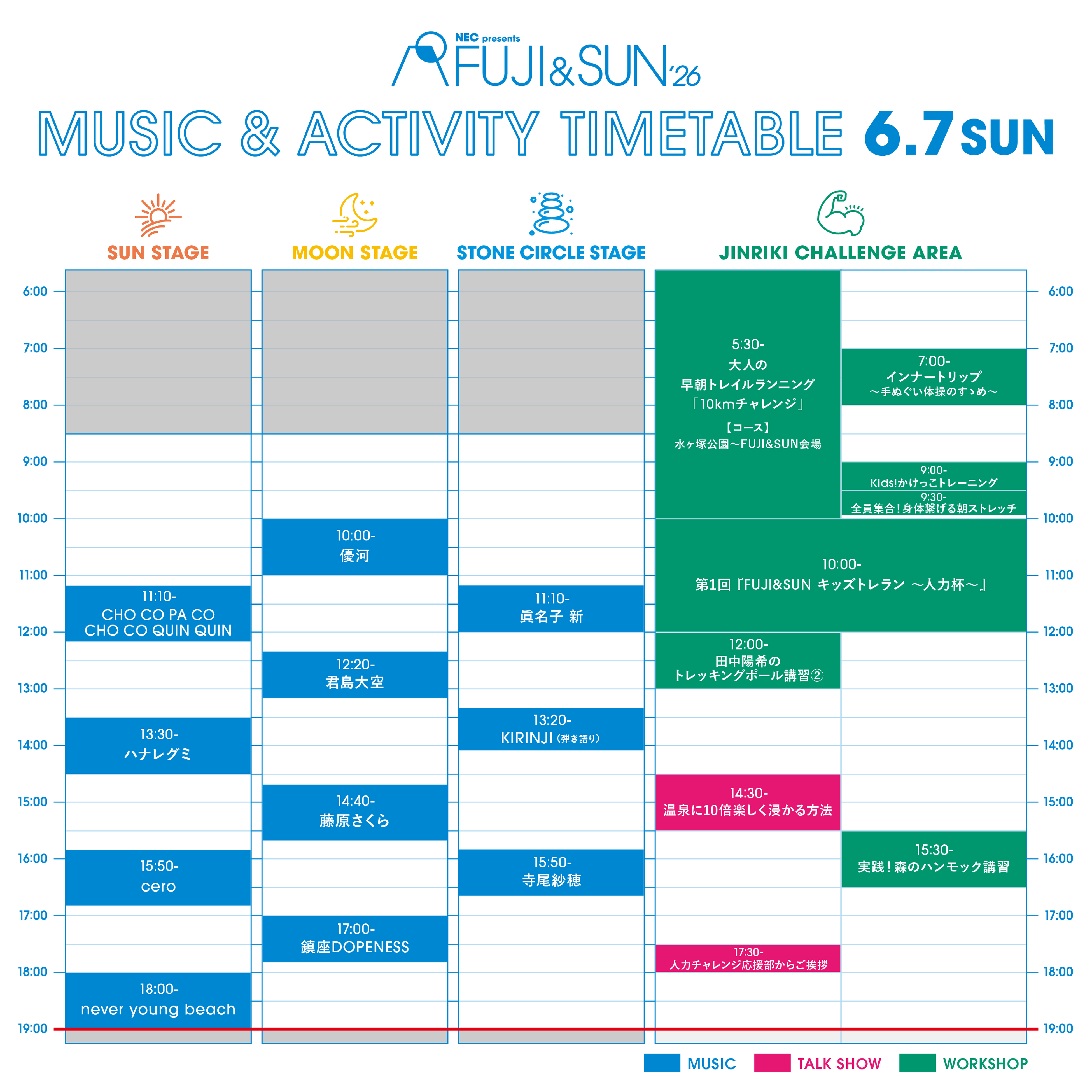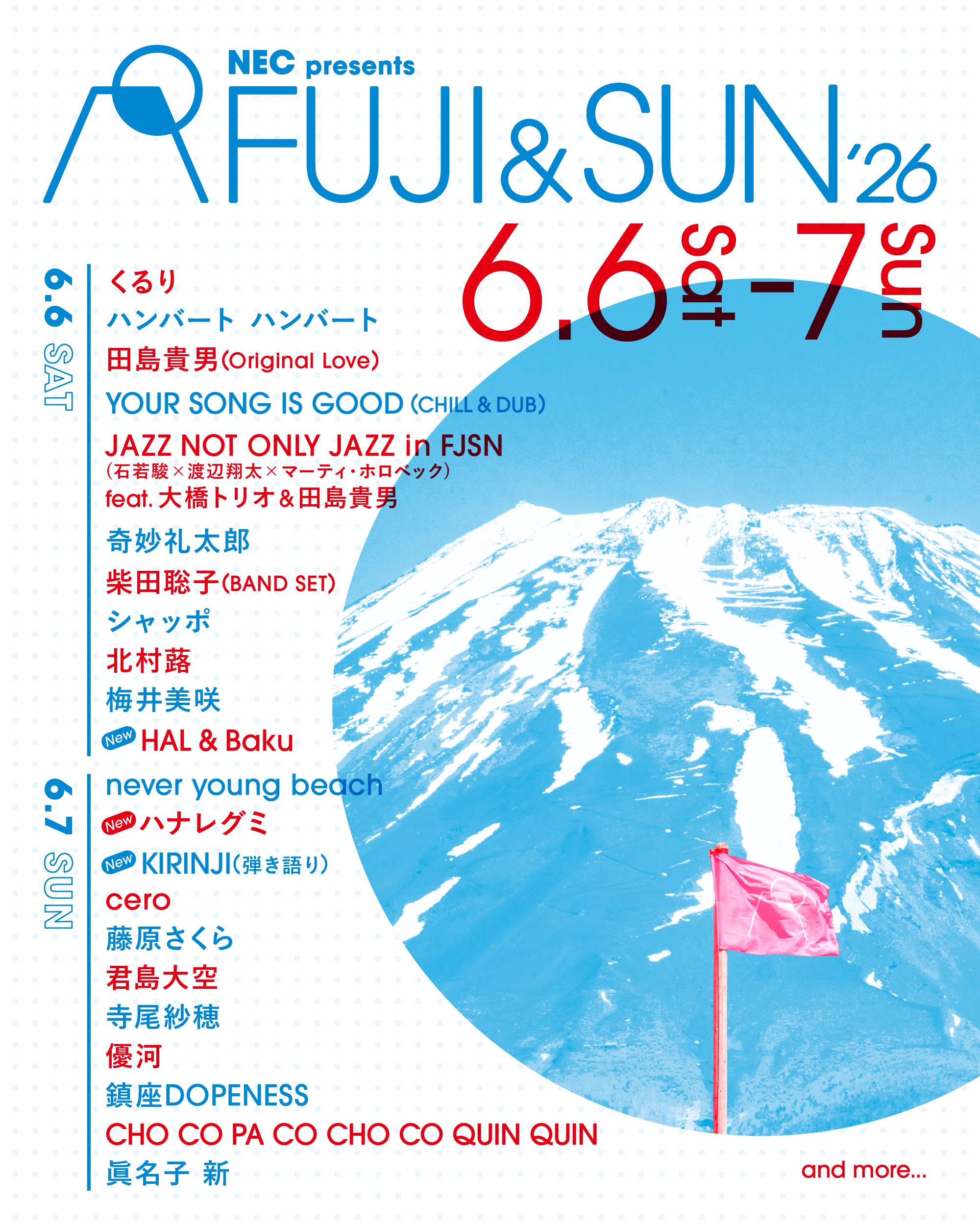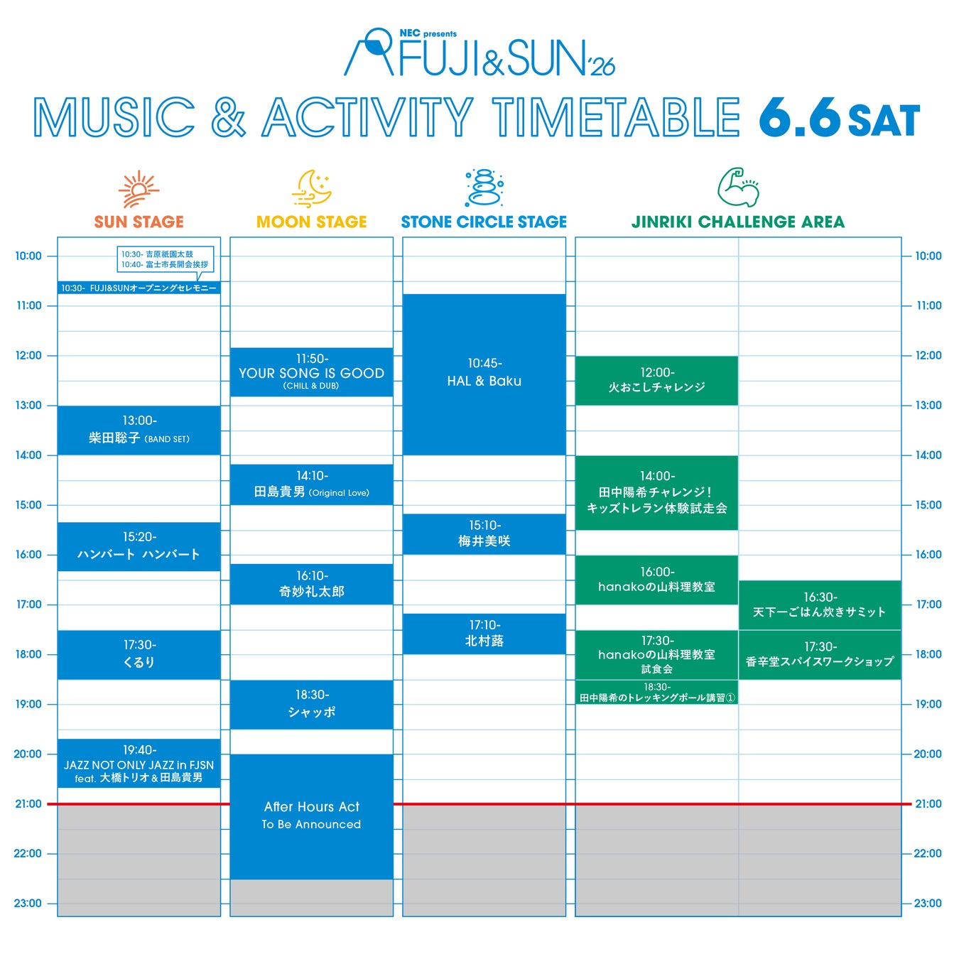 6月初めの週末開催がいよいよ近づくなか、「NEC presents FUJI & SUN ’26」がタイムテーブルを発表!大自然の中で楽しむ音楽、キャンプ、グルメに加えほかのフェスとは一線を画す冒険心とチャレンジ精神を刺激する体験型アクティビティの数々が揃い心躍る2日間の全貌がいよいよ明らかになりました。どんな景色の中で音楽を味わうか、どのコンテンツに参加するか。ぜひ自分だけの冒険を思い描きながら開催へのワクワクをさらに膨らませてください!また、ご好評につき一部の限定セット券がすでに完売となっているほか、駐車券やキャンプ券、バスチケットは例年以上の反響をいただいております。今後、売り切れる可能性がございますので各種チケットのお求めはお早めにどうぞ!