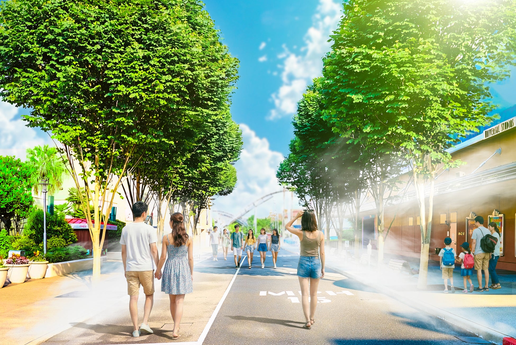 昨年ハリウッド・エリアに誕生した、青々と茂ったケヤキの木陰で休息できる並木道『グリーン・ストリート』に、足元から吹き上がるミストを追加することで、より一層の体温低下を狙う『クール・グリーン・ストリート』が登場します。同じくハリウッド・エリアに、ケヤキの木陰で涼むことができる憩いの場も新しく設置します。