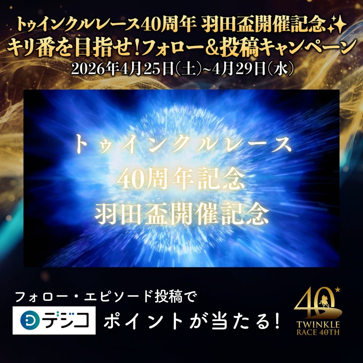参加方法は、TCK公式Xアカウント(@tck_keiba)をフォローし、4月25日(土)から羽田盃(JpnⅠ)当日まで毎日発表されるテーマに沿って、ご自身のエピソードを投稿するだけ!投稿の順番が予告された「キリ番」と一致した方には、デジコポイントをプレゼントします。