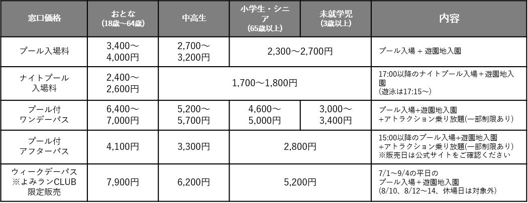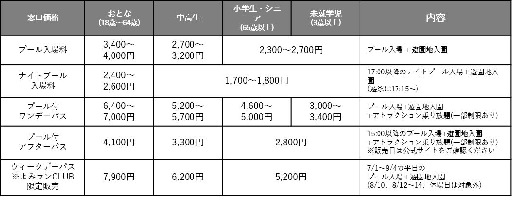 中高生・小学生・未就学児(3歳以上)・シニア(65歳以上)1,700円 ※特定日は+100円