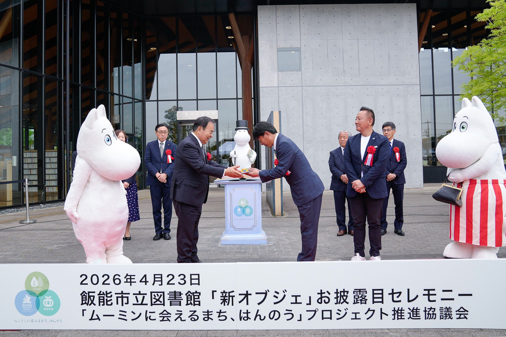 飯能市(市長:新井 重治)、株式会社ムーミン物語(社長:望月 潔)、西武鉄道株式会社(社長:小川 周一郎)、飯能商工会議所(会頭:加藤 義明)、一般社団法人奥むさし飯能観光協会(会長:中里 忠夫)の5者による「ムーミンに会えるまち、はんのう」プロジェクト推進協議会(以下:本協議会)は、本日4月23日、飯能市立図書館にムーミンパパオブジェを設置し、お披露目セレモニーを開催しました。