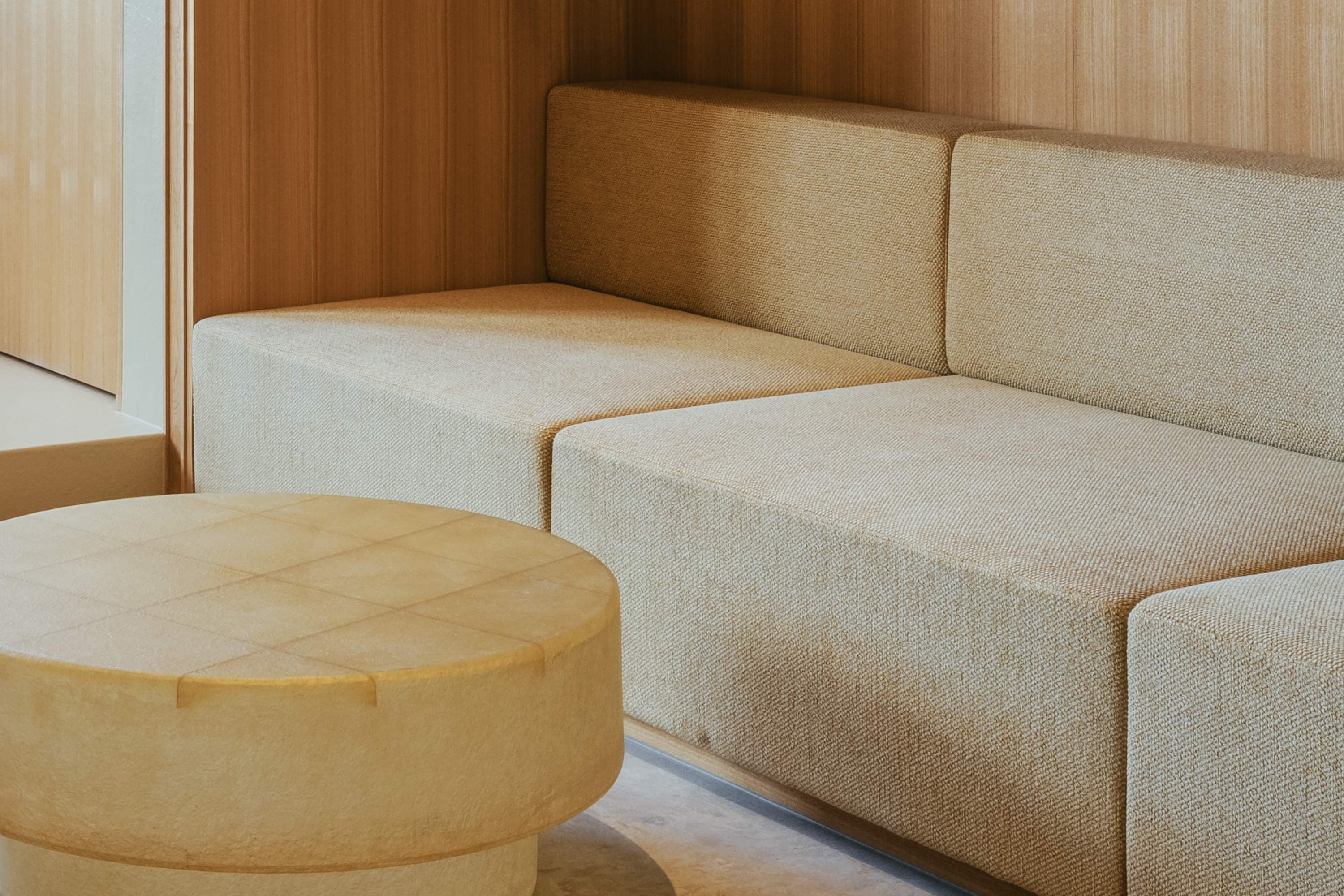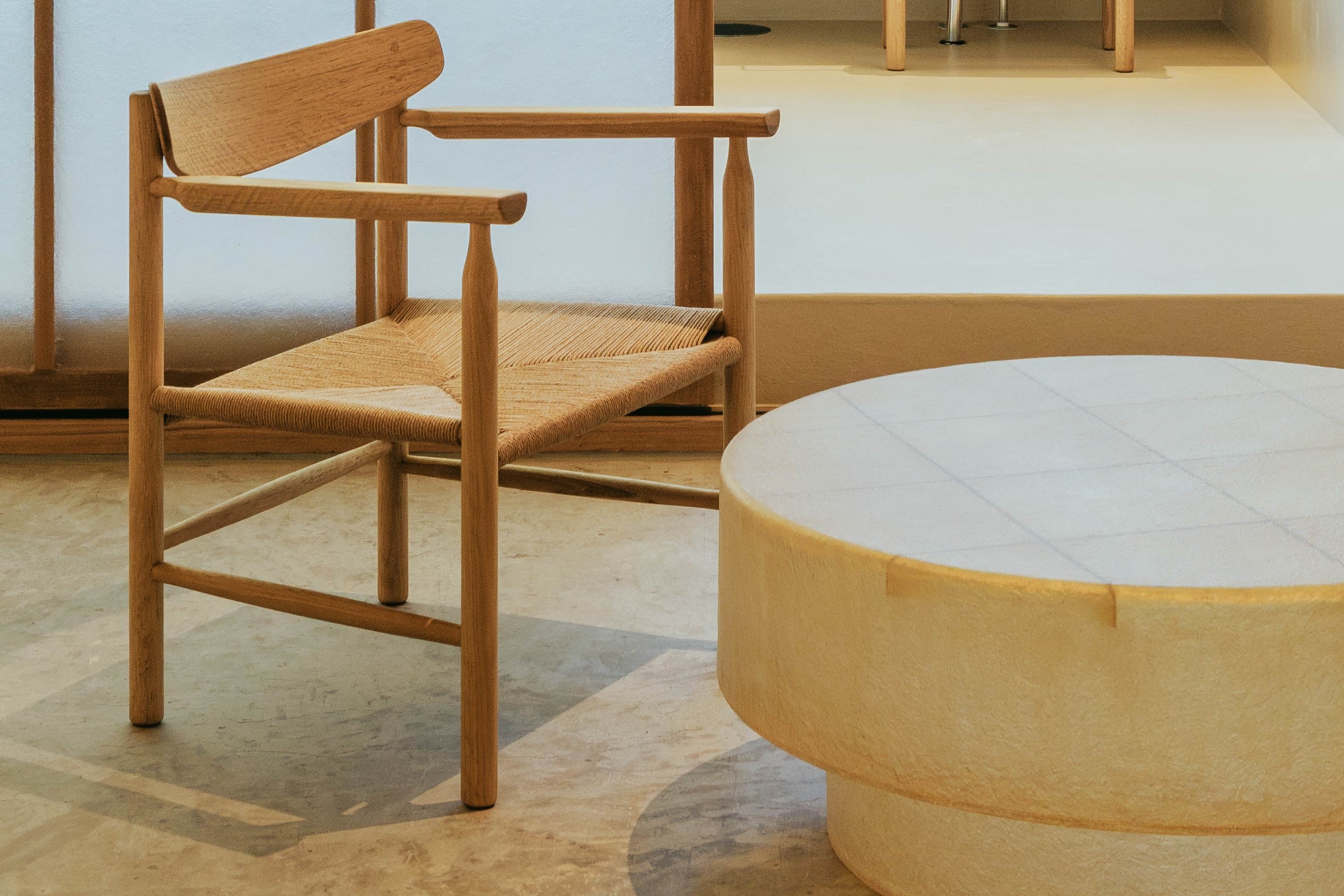 ザラザラとした質感のリシンに、船体に用いられるFRP。一般的に屋外で使われる建材で仕上げました。半透明のFRP建具やテーブルは、空間に揺らぎをあたえます。やわらかなベージュに包まれるひとときをお過ごしください。