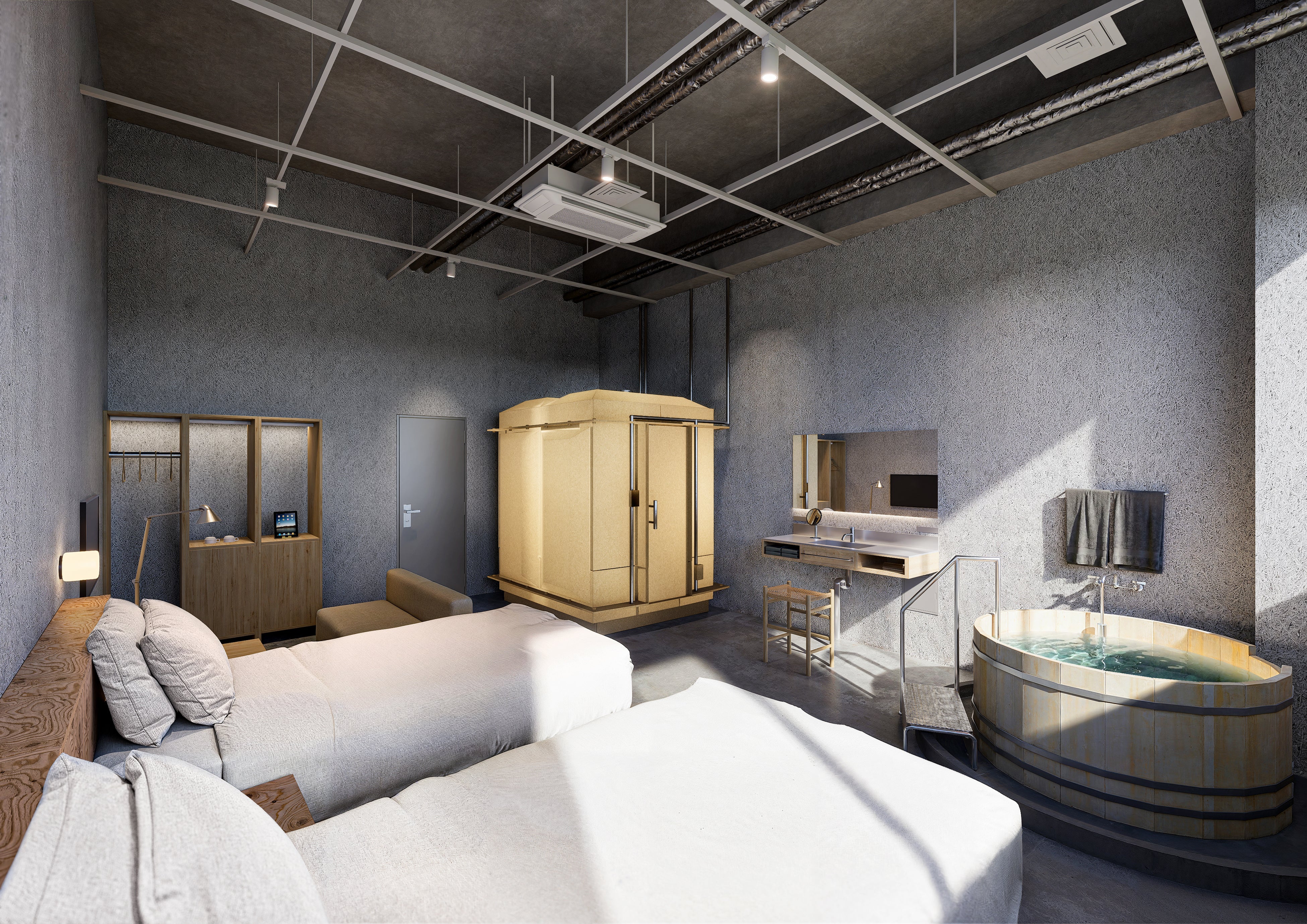 天井高は4.5m。開放感ある空間を活かすため、剥き出しの建築躯体に家具のみを配置しました。窓際の檜風呂も、壁で仕切らずフラットに。一際存在感を放つシャワーユニットは、行燈のようにやさしいあかりを灯します。