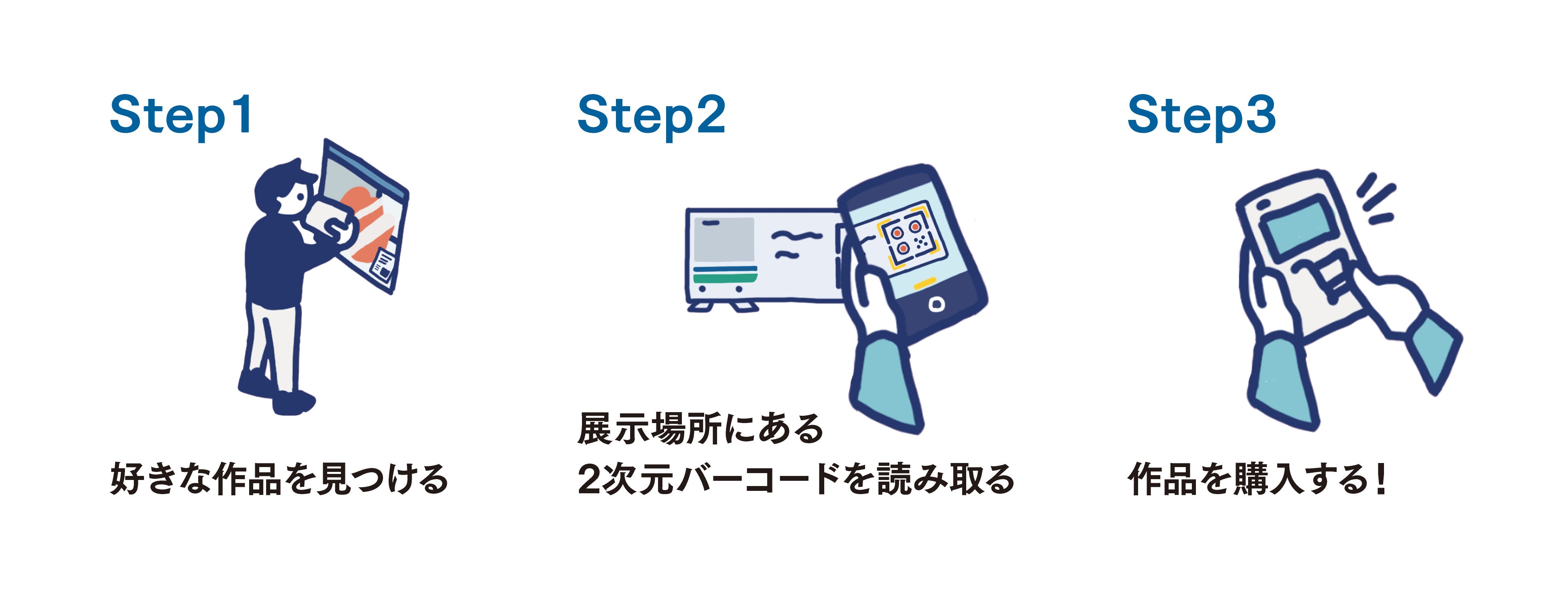駅構内に設置された2次元バーコードをスマートフォンで読み込むと、作品の購入サイトにアクセスすることができます。駅で見かけたお気に入りの作品を購入をすることで、アーティストへの直接的な支援にも繋がる仕組みです。「KOBE SUBWAY MUSEUM」は、アーティストの創作活動への持続的な支援を目指しています。