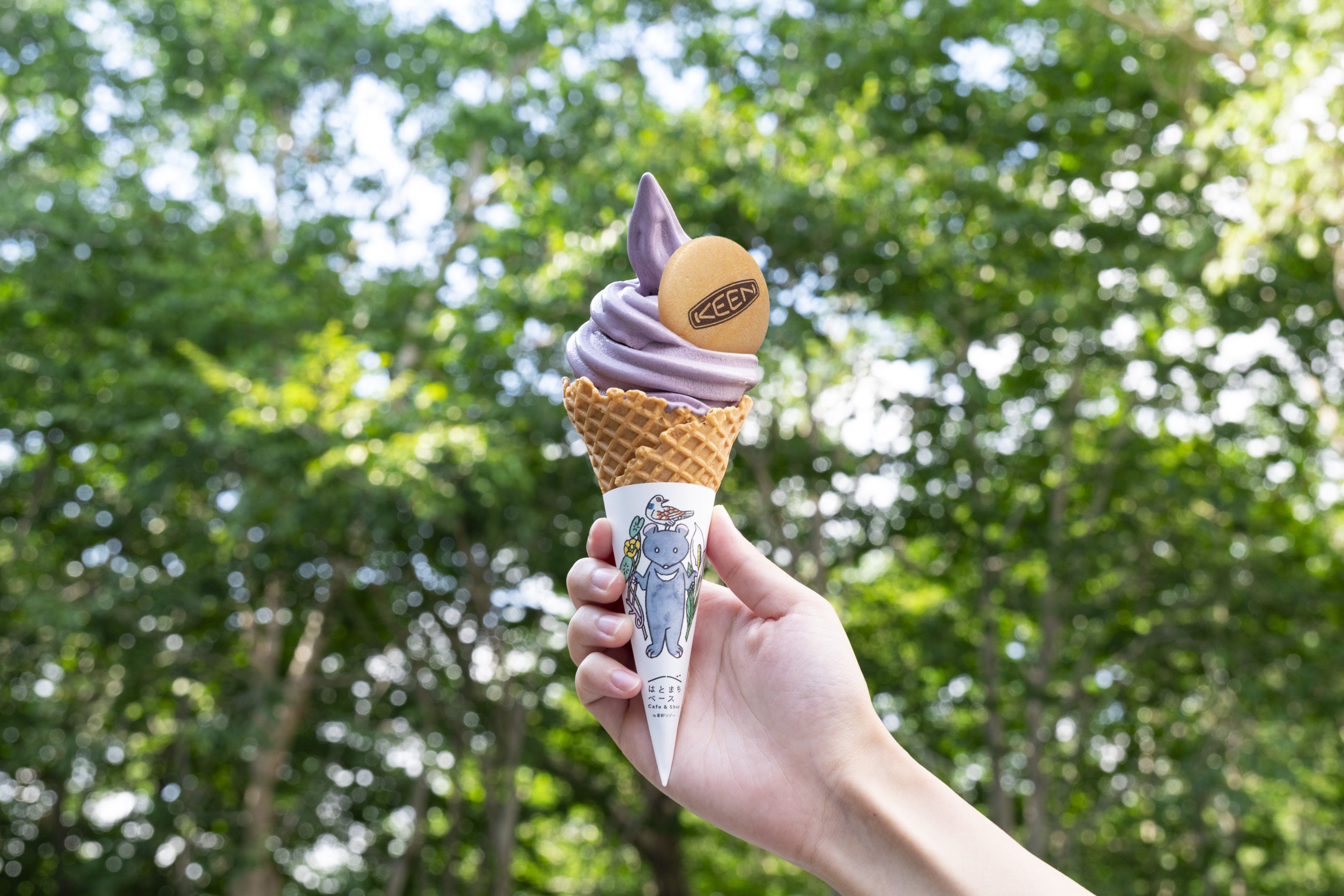 名物「花豆ソフトクリーム」にKEENのロゴ入りでクリスピーな味わいの最中の皮を添えて2日間限定販売します。濃厚な花豆の味わいと、今だけの特別な装いはハイク後のご褒美に最適。思わず写真も撮りたくなる可愛いらしいフォルムです。