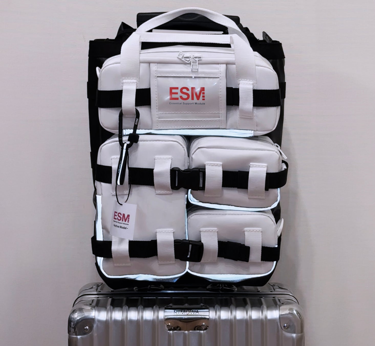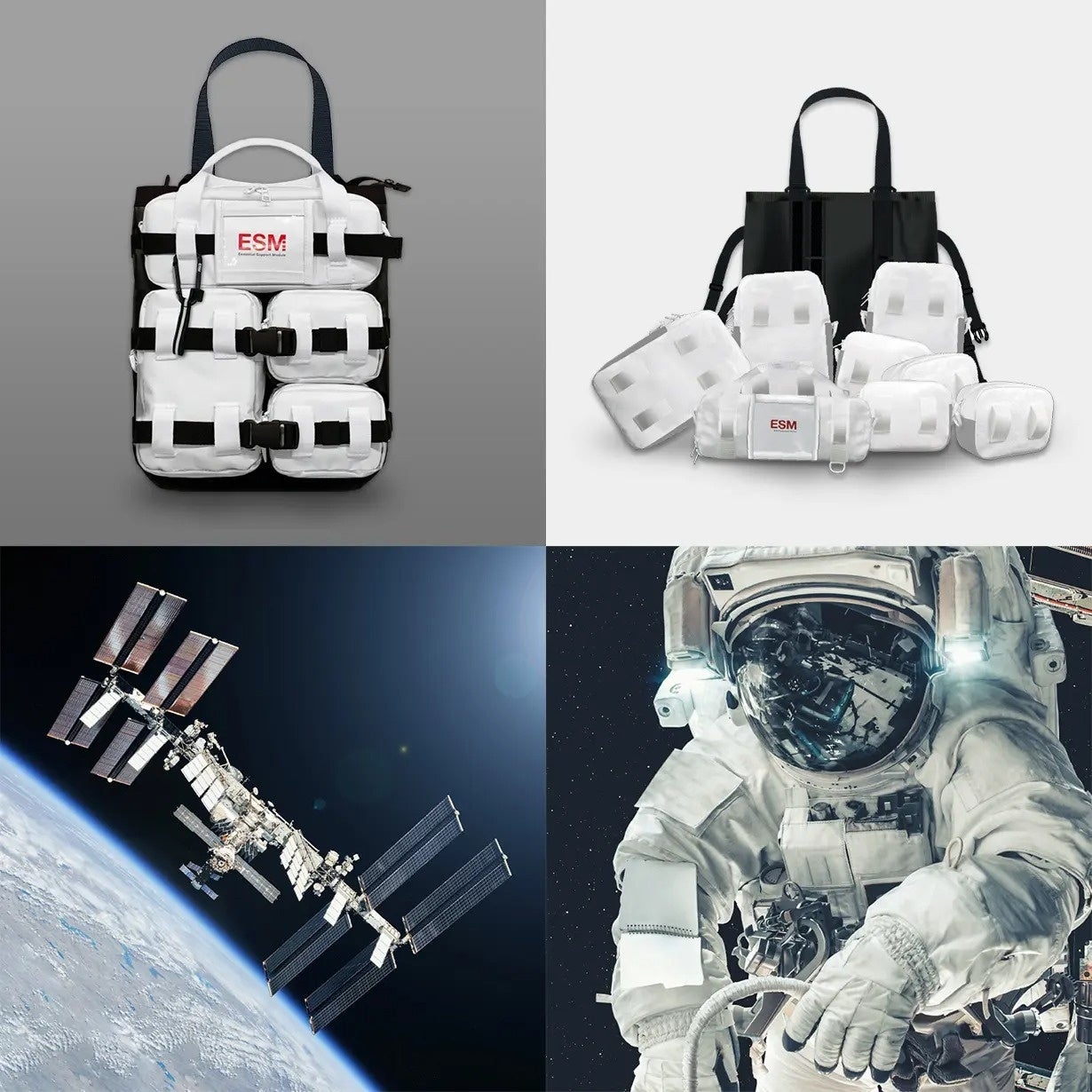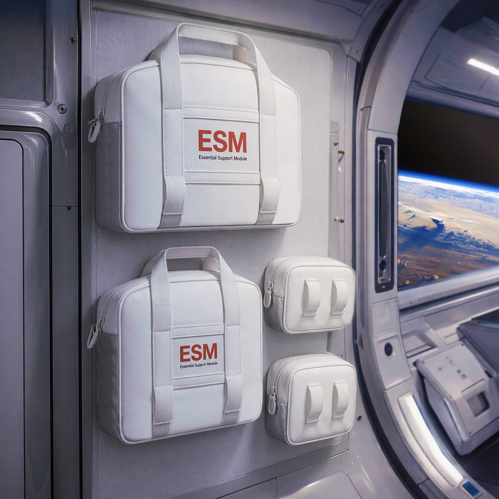 宇宙でも、地上でも活用できるというコンセプトのもとデザインされた本バッグでは、宇宙ステーションなどの微小重力環境下で、身の回り品が浮遊しないよう面ファスナーで壁に固定する仕組みに着想を得て、ESMのモジュール裏面に面ファスナーを採用しました。宇宙空間を想定した仕様として、モジュールを壁に貼り付けて、クローゼットのように活用できるシステムバッグとなっています。