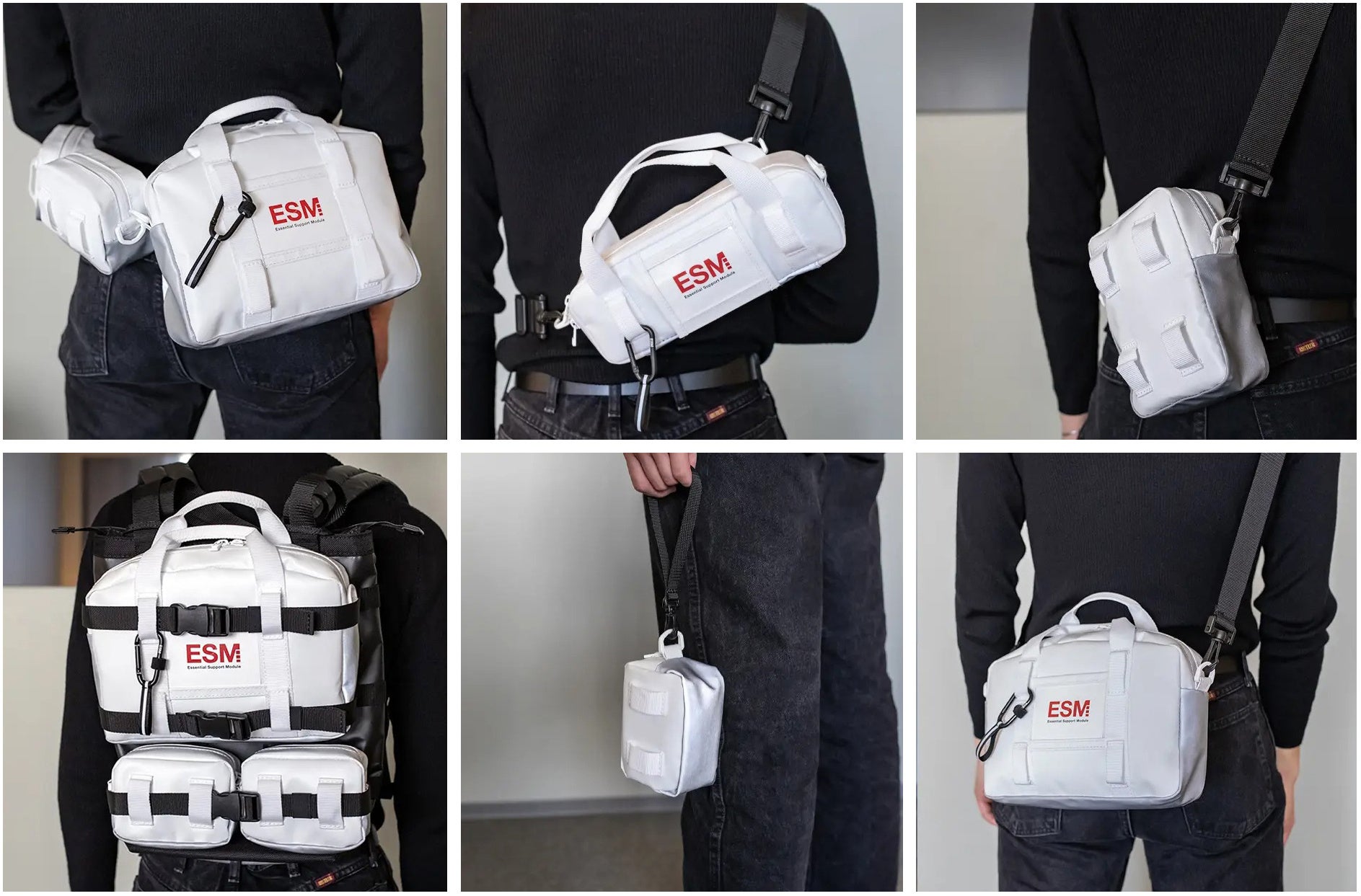 ESM本体から切り離したモジュールは、3種類の付属ベルト(ウエストベルト、ショルダーベルト、ポーチストラップ)を用途に応じて使い分けることで、多様なスタイルで持ち運ぶことが可能です。