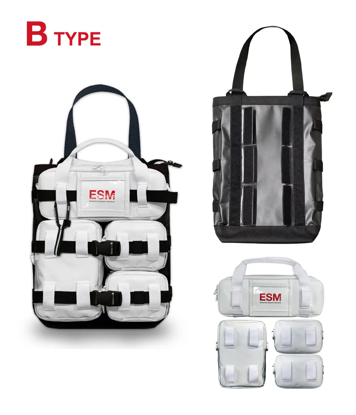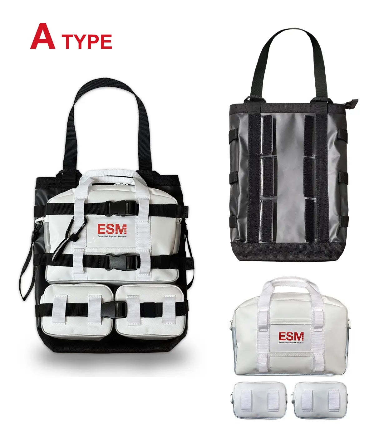 持ち手のついたサブバッグ一つと中型モジュールポーチ1 点、小型モジュールポーチ2 点がセットになったタイプ。作業現場やアウトドアなどのツールバッグなどに適したセットです。