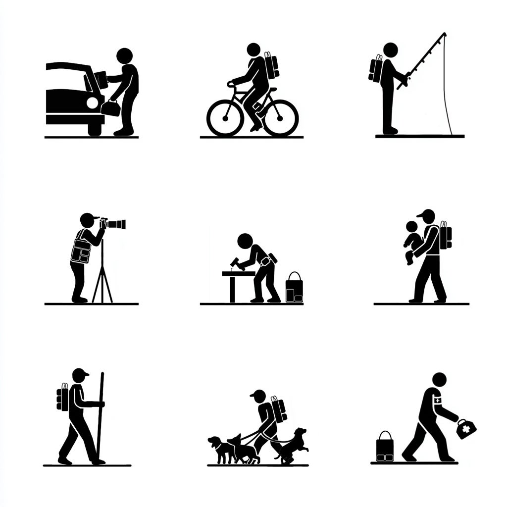 日常づかいはもちろん、サイクリング・釣り・山登りなどアウトドア、カメラマンやエンジニア、大工やものづくり職人など専門性の高い職種の現場装備や、普段使いのバッグとして。 また、個人や企業の災害時の持ち出し用バッグ、学校での防災教育ツールなど、幅広いシーンで活用いただけます。
