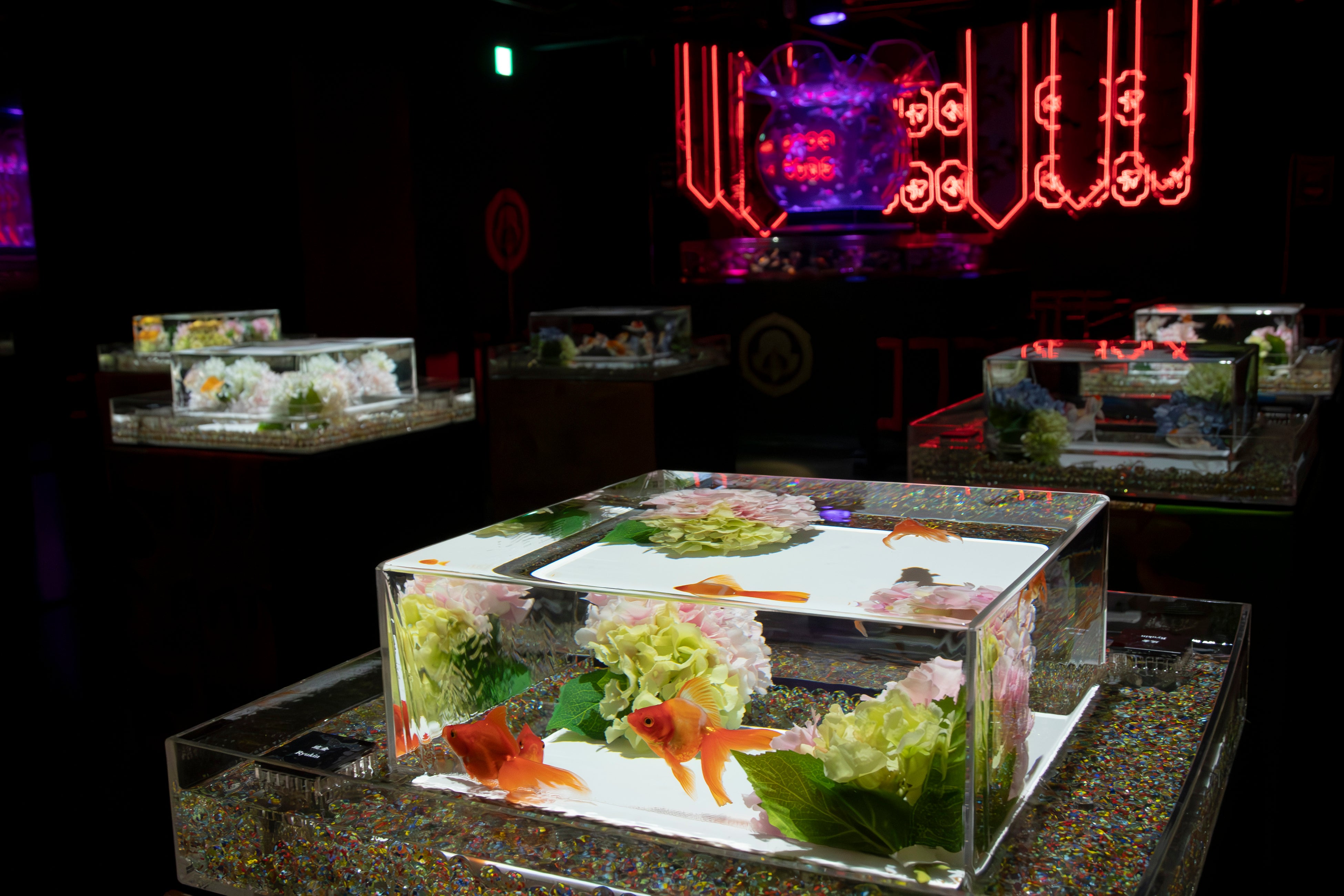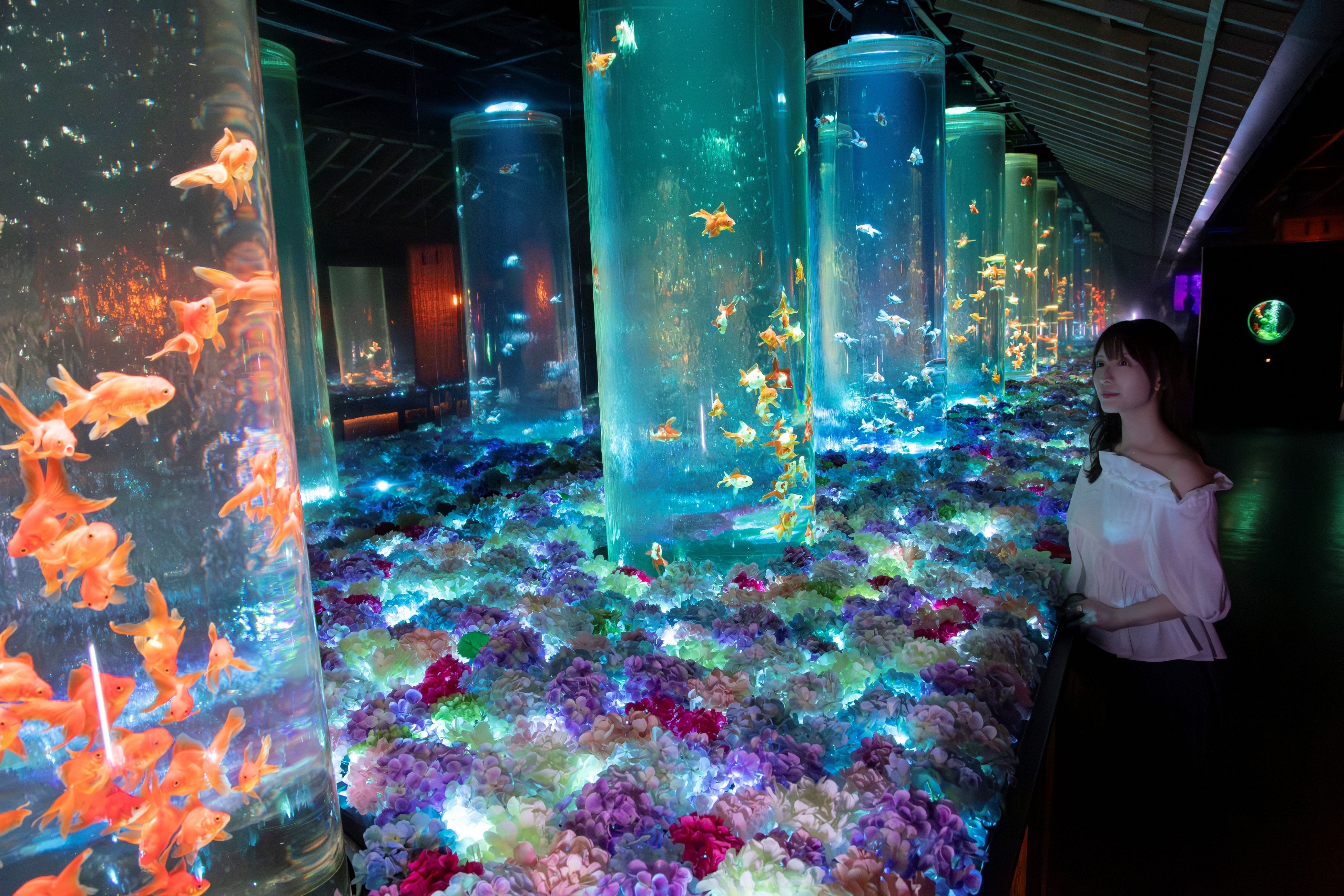 初夏を思わせるライティングにより空間は様々な彩りに変化し、その中を金魚が優美に舞い泳ぎます。