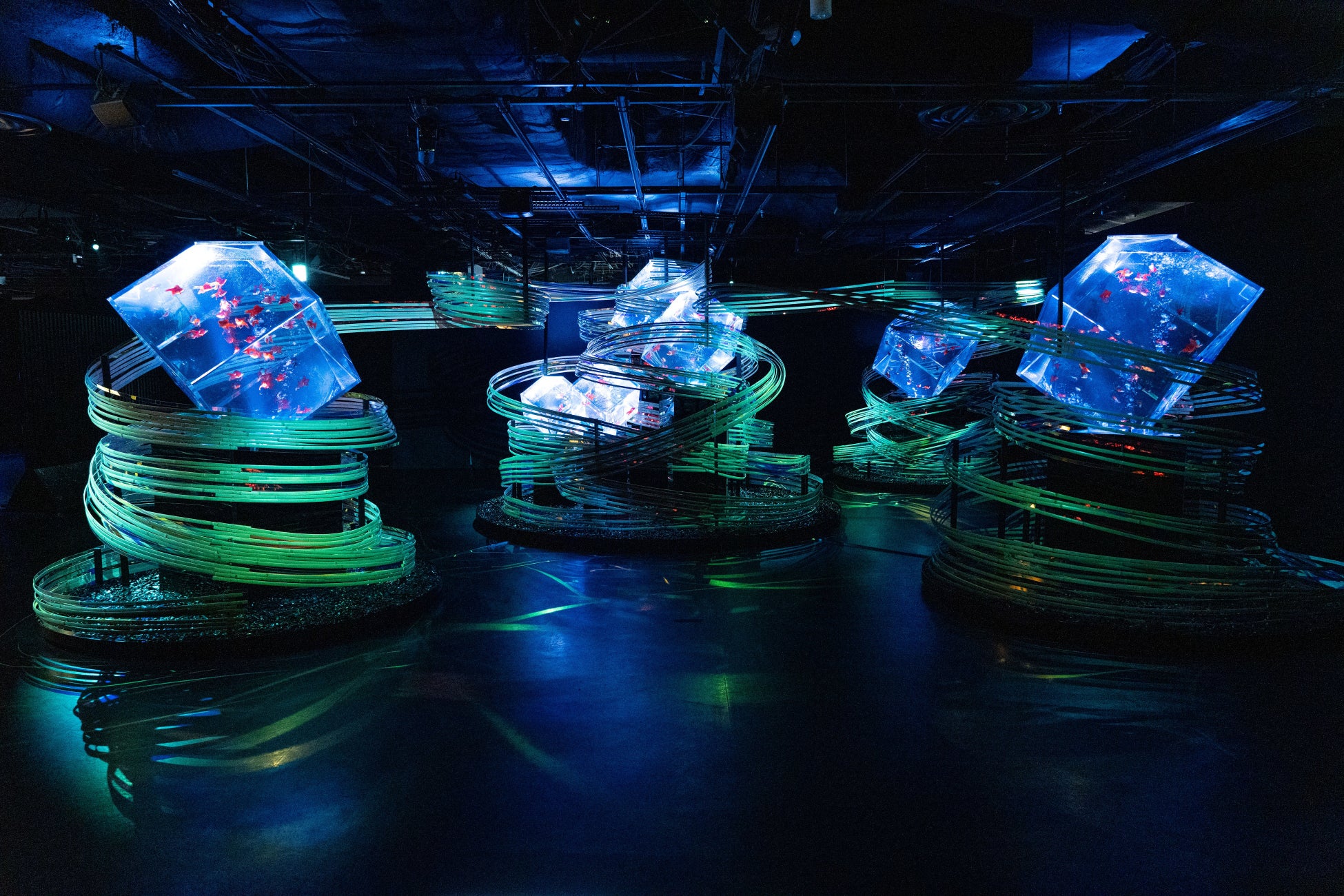 金魚泳ぐ水槽作品を光・香・音で演出する没入型エンターテインメントアート。