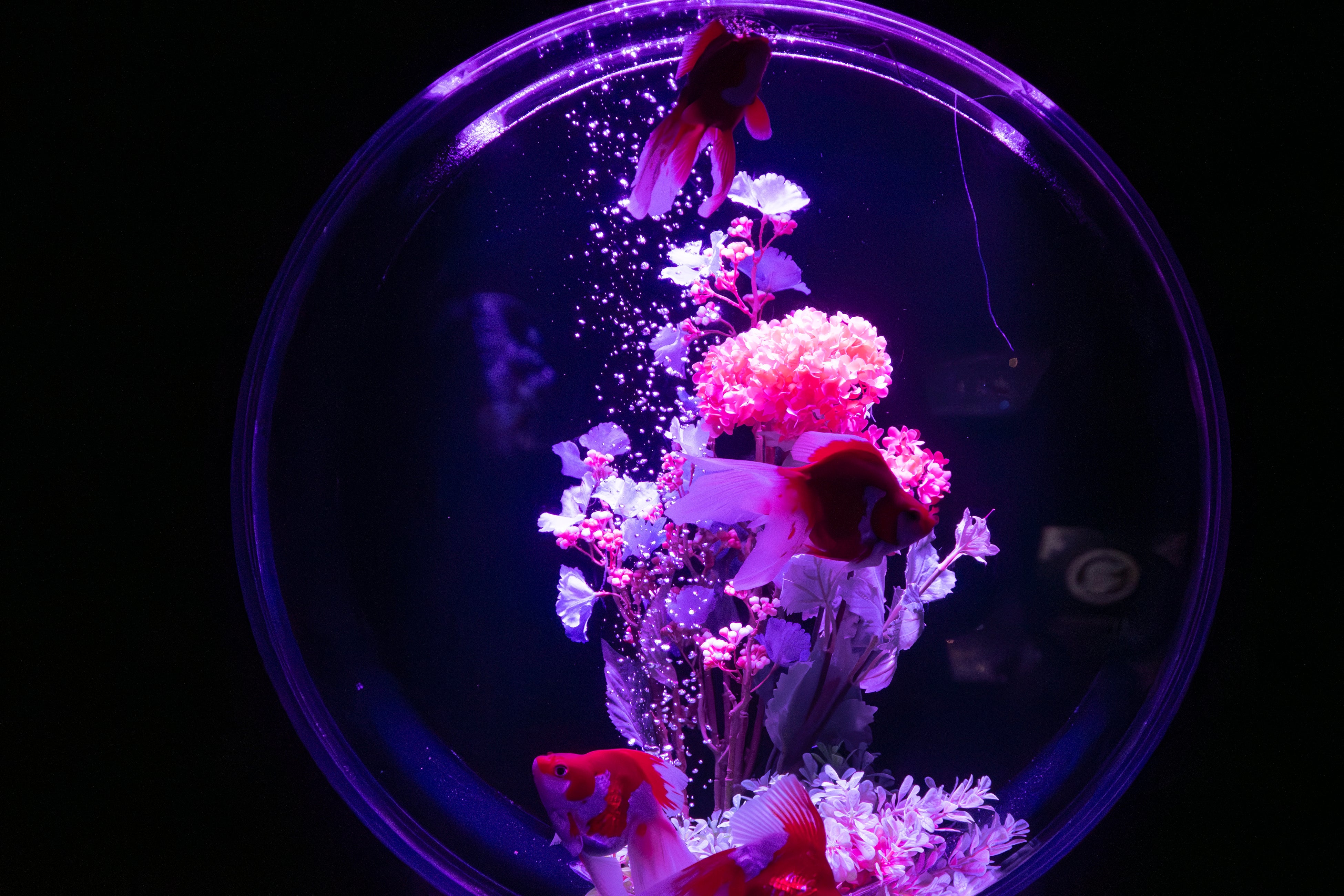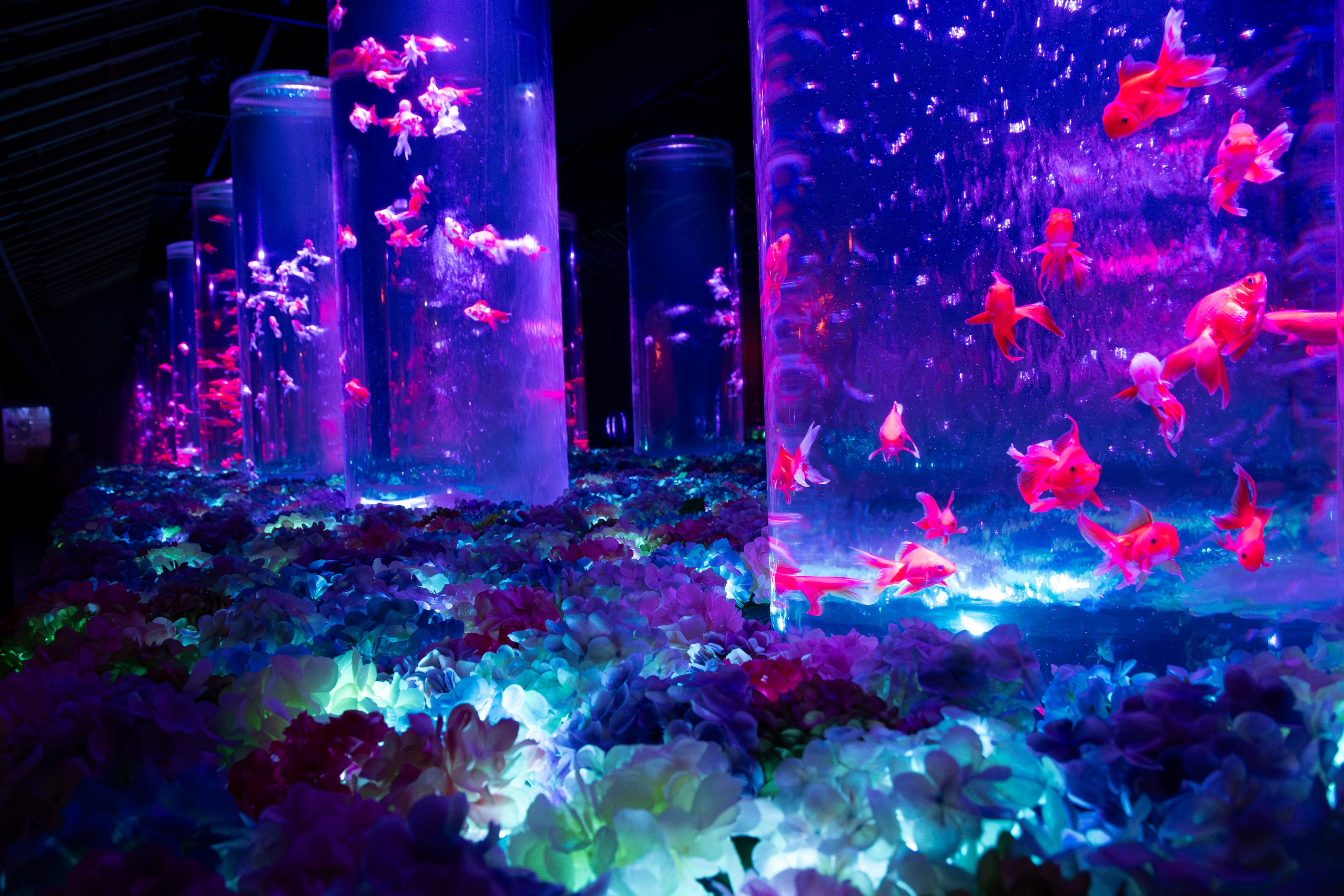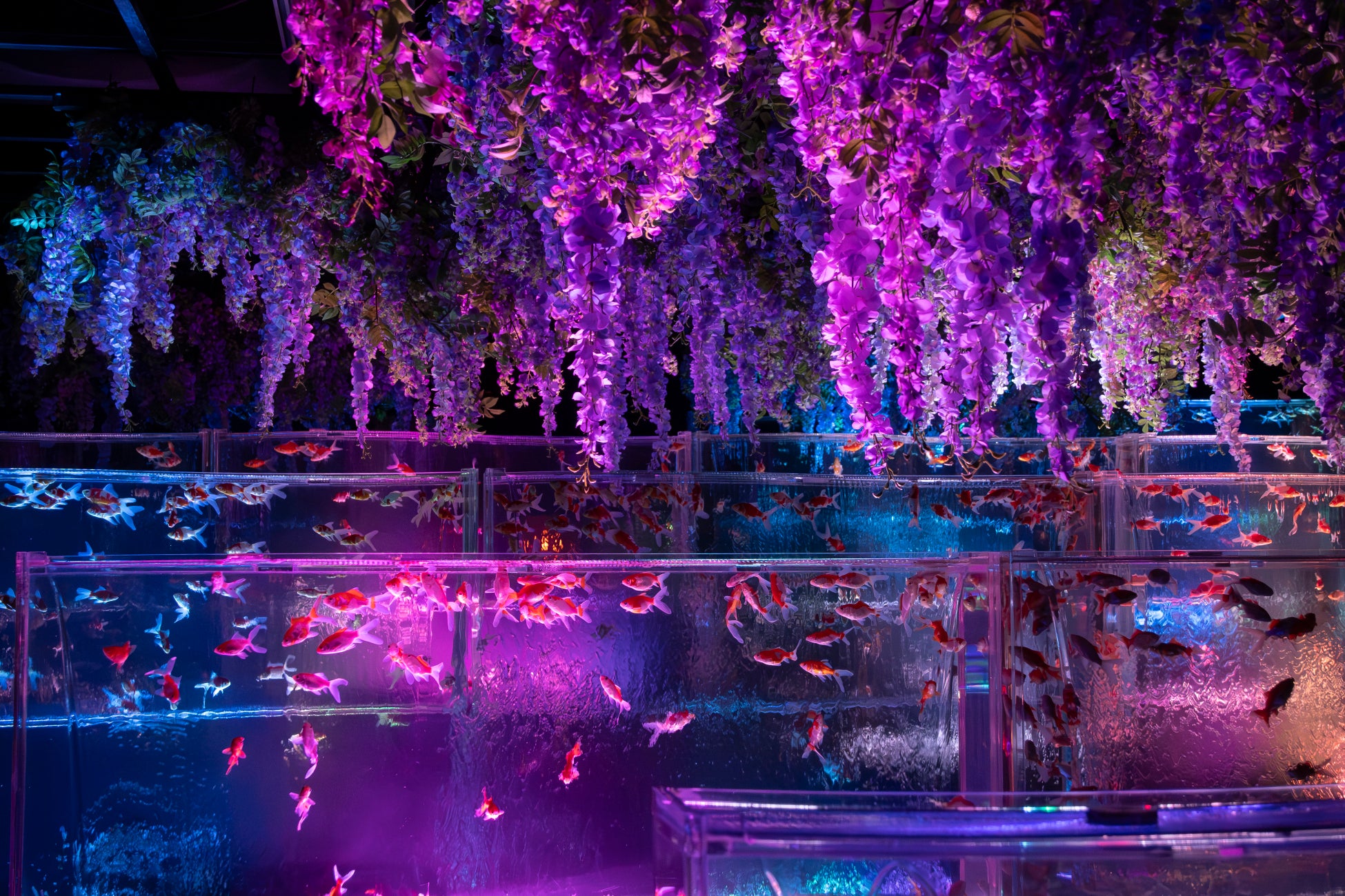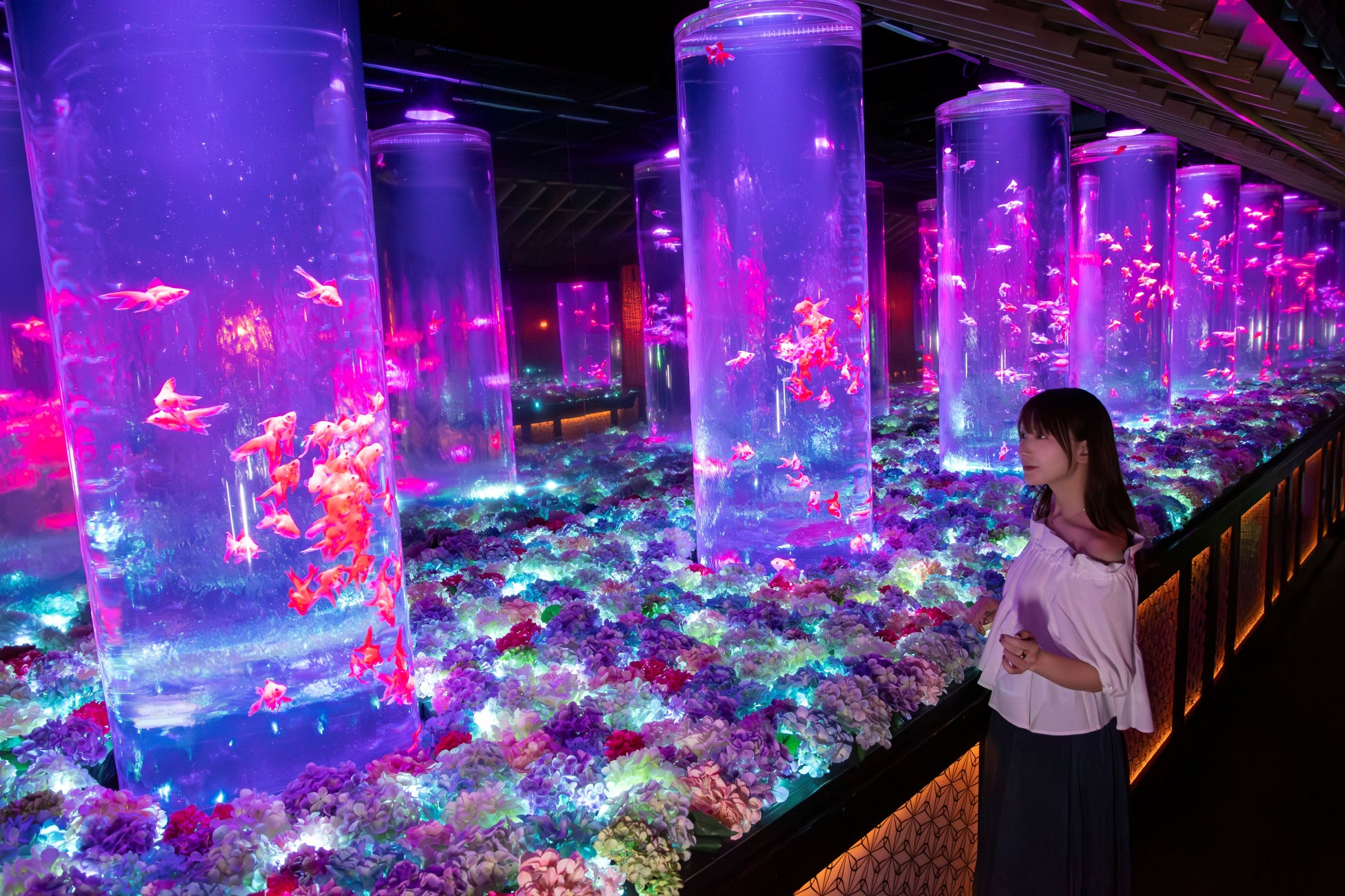 紫色に染まる空間のなかを金魚が優雅に泳ぎ、艶やかな景気に包まれる体験をお楽しみください。