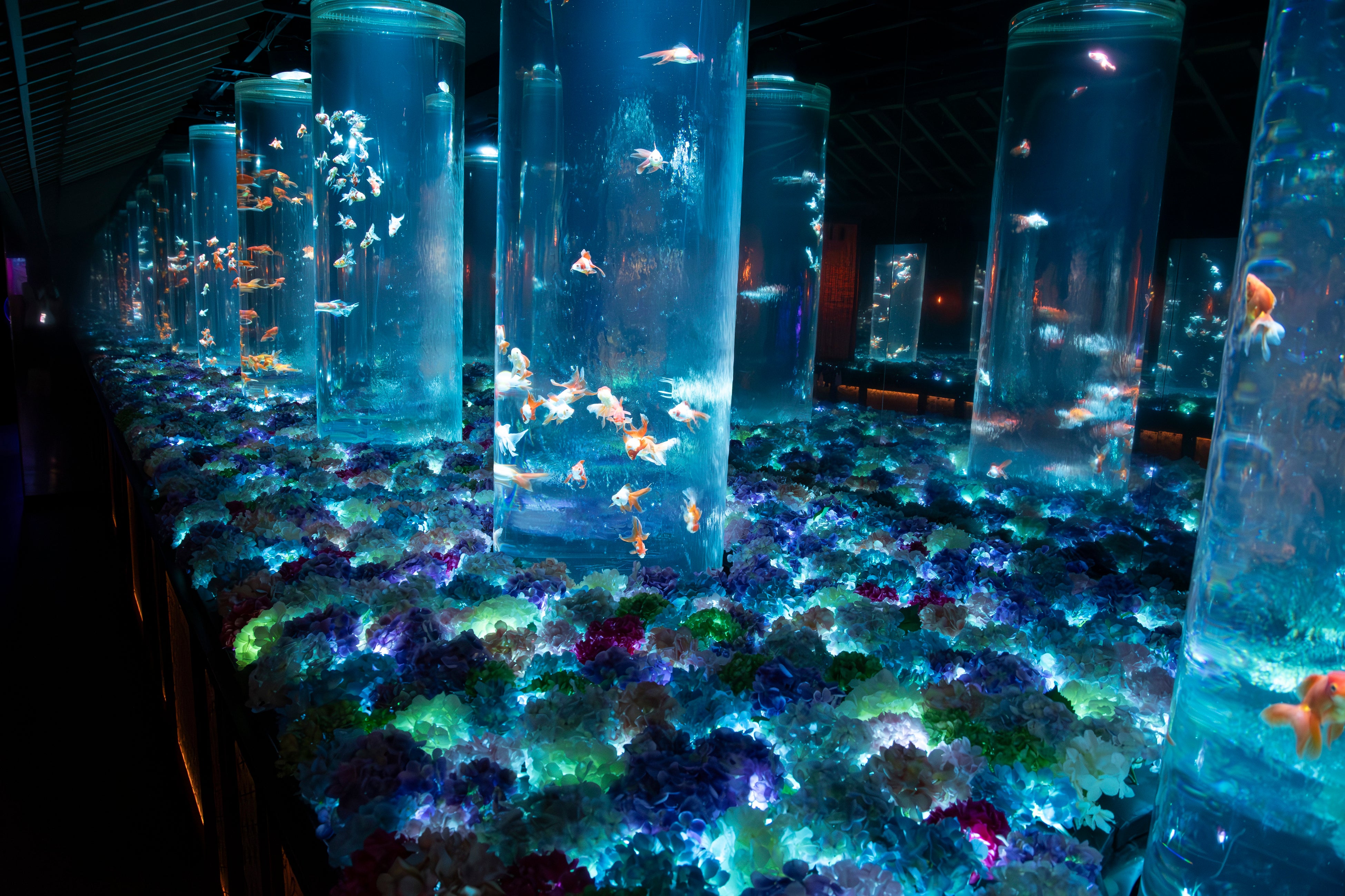 合わせ鏡により水槽が立ち並ぶ空間が無限に広がる“金魚の回廊”に、色とりどりの紫陽花が咲き誇ります。