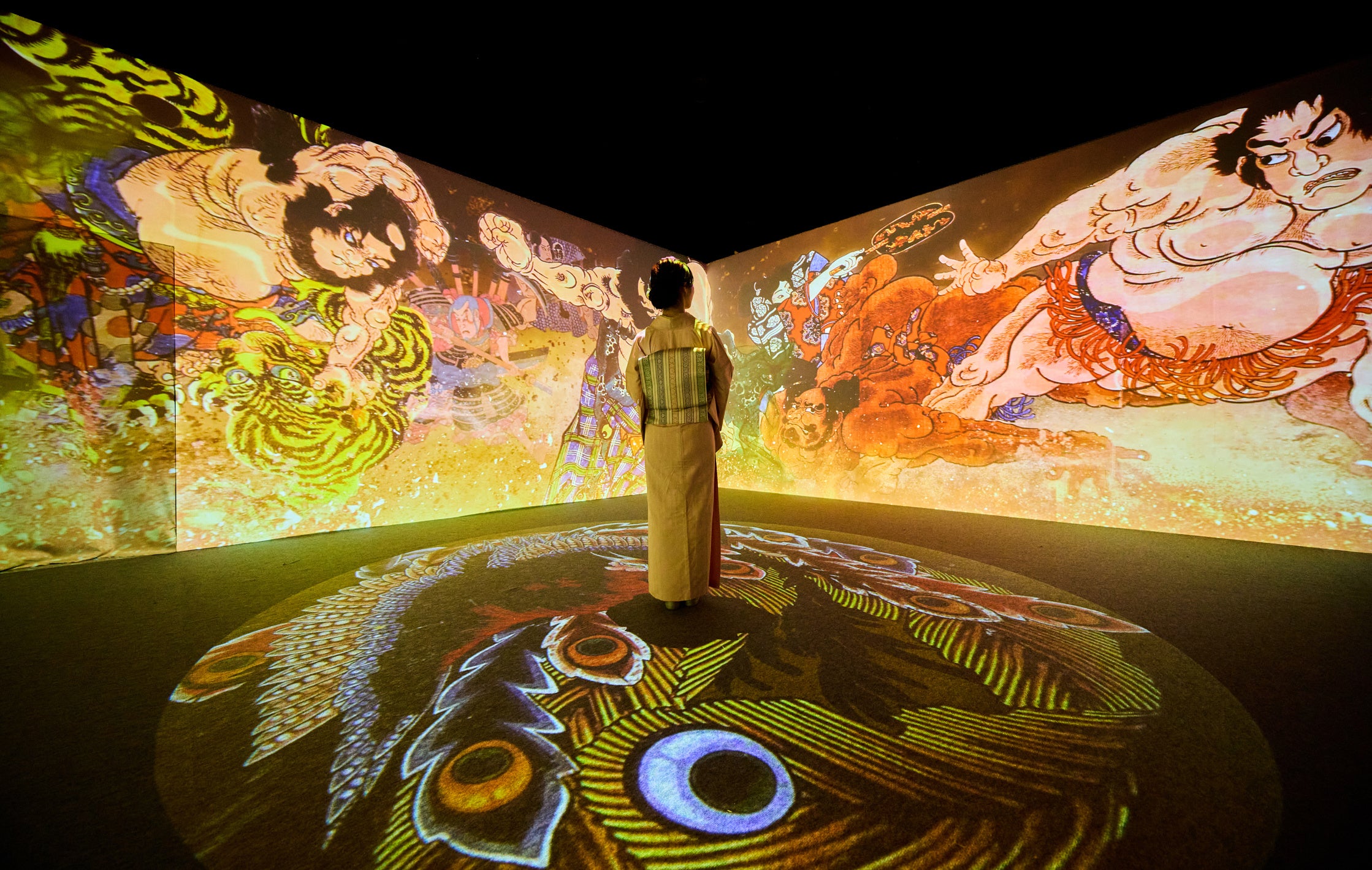 「動き出す浮世絵展」は、葛飾北斎、歌川国芳、歌川広重、喜多川歌麿、東洲斎写楽、歌川国貞など世界的な浮世絵師の作品300点以上をもとに、3DCGアニメーションやプロジェクションマッピングを駆使して大人から子どもまで楽しめるグラフィカルなデジタルアート作品として描き、立体映像空間で浮世絵の世界に没入できる体感型デジタルアートミュージアムです。