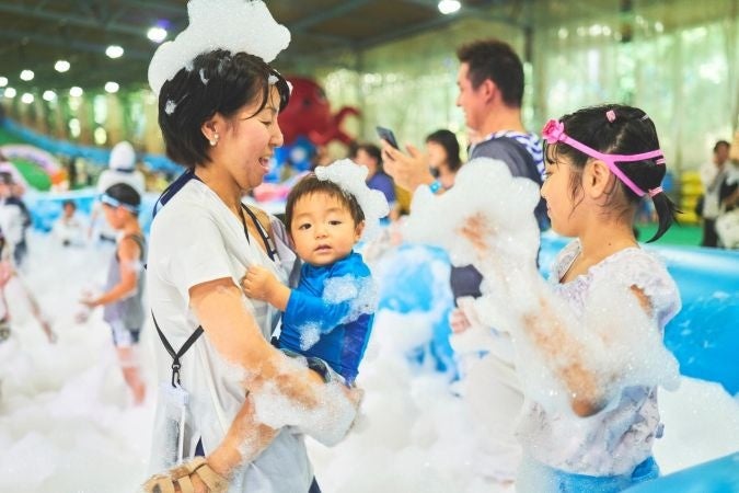 親子で楽しめるロングスライダーの他にも、毎日開催される「泡タイム」で、子どもたちの笑顔がはじけます♪真夏に雪あそびが楽しめる「ひんやりエリア」は7月中旬OPEN!