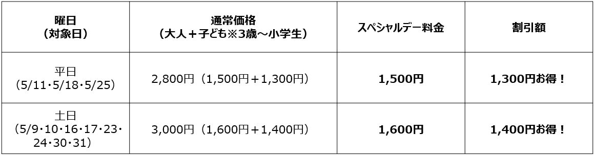 割引内容:大人1名につき子ども(3歳~小学生)1名で以下の特別料金