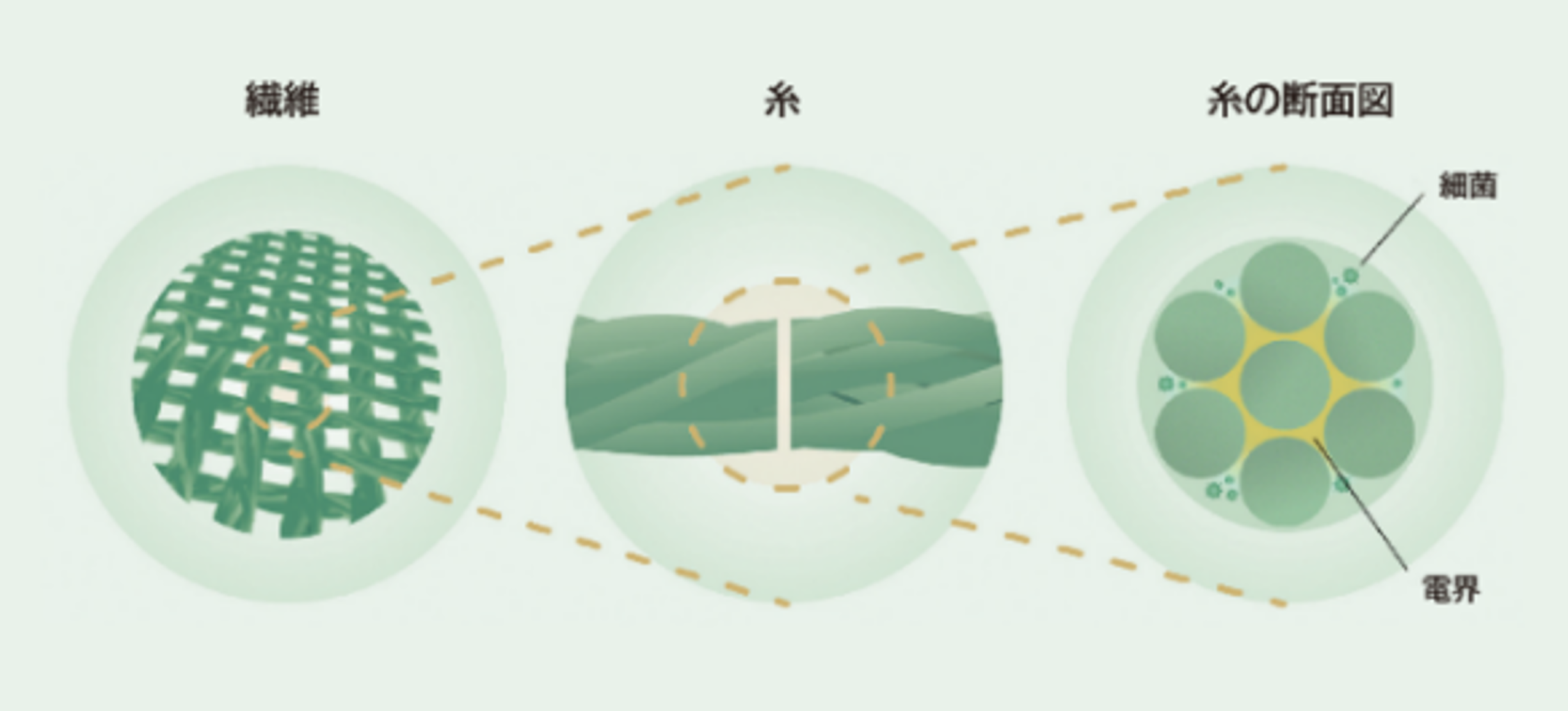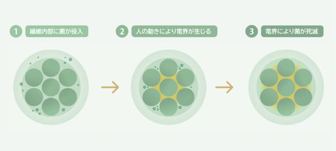 本シリーズには、当社が開発した新素材「電気の繊維」ピエクレックスが採用されています。ピエクレックス繊維は、人の動きによって繊維が動くことで微弱な電気を発生させ、抗菌効果※1を発揮する素材です。