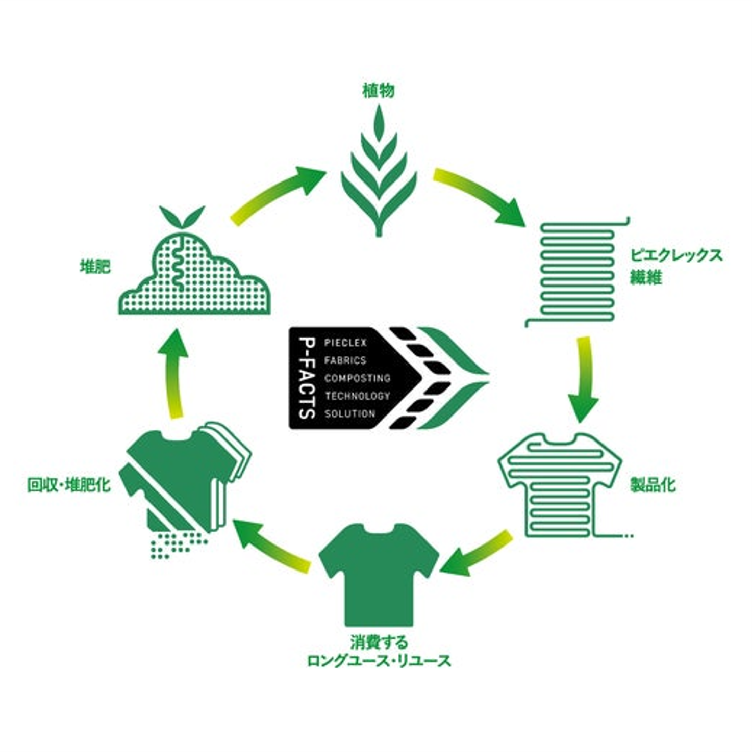 「P-FACTS」(ピーファクツ:PIECLEX FAbrics Composting Technology Solution)は、ピエクレックス社が植物由来のポリ乳酸素材「電気の繊維」ピエクレックスを使用したアパレル製品や繊維製品を回収し、堆肥化までを一貫して行う循環インフラです。多くのパートナー企業、自治体、福祉施設、学校法人などのステークホルダーと連携し、既に運用が始まっています。
