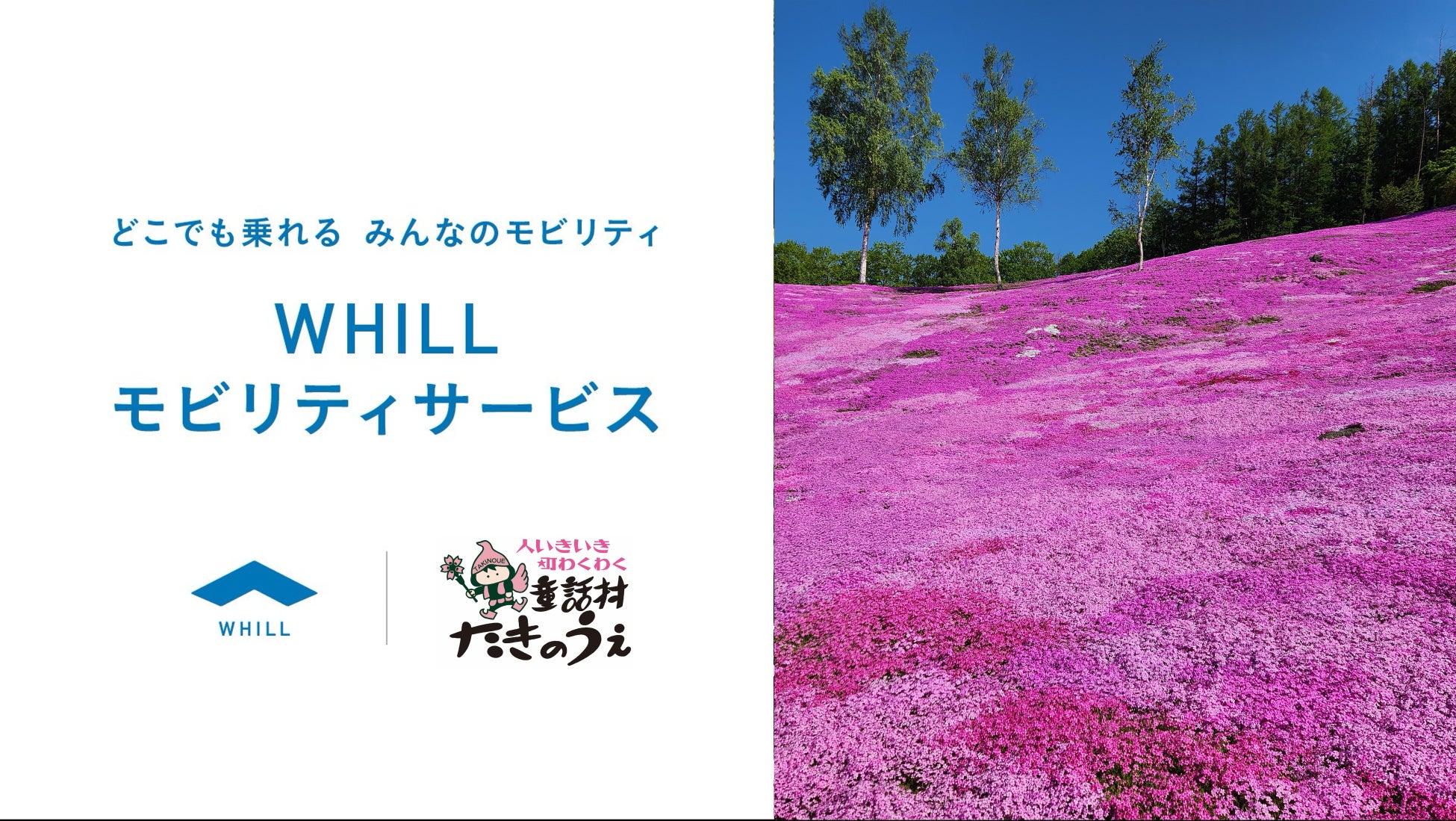 WHILL株式会社(本社:東京都品川区、代表取締役社長 CEO:杉江理、以下「WHILL社」)は、芝ざくら滝上公園(北海道・滝上町)において2026年5月1日から、免許不要で歩行領域を走行する近距離モビリティWHILL(ウィル)を活用した移動サービス「WHILLモビリティサービス」が開始されることを発表いたします。日本最大級の群生を誇る芝ざくらが見頃を迎え、多様な方の来園が多く見込まれる中、「童話村たきのうえ芝ざくらまつり(以下「芝ざくらまつり」)」に合わせてアクセシビリティを整えることで、年齢や身体状況、障害の有無などに関わらず誰もが快適に満喫できる鑑賞体験を提案いたします。