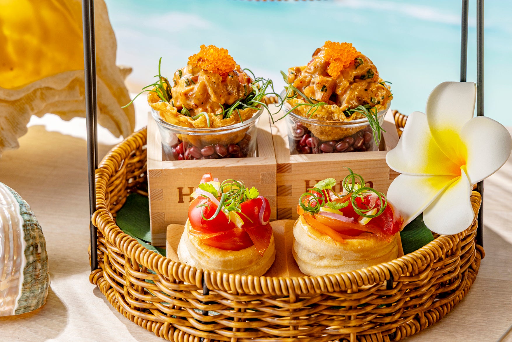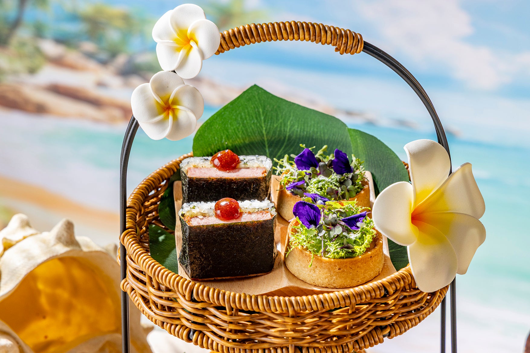 南国気分を盛り上げるおしゃれな籠風スタンドには、伝統的なハワイ料理に洗練されたフレンチアレンジを掛け合わせたハワイXフレンチフュージョンの前菜“セイヴォリー・ププ”をご用意しました。ハワイで古くから親しまれるタロイモの葉“ルアウリーフ”をココナッツミルクで丁寧に煮込み、やわらかなタコとともにパイ生地に閉じ込めた「タコ・ルアウキッシュ」、厚切りスパムを香ばしく炙り、パイナップルの甘酸っぱさを効かせた蒲焼きソースをまとわせ、海苔で包んだ「グリルド・スパムむすび メダリオン」は、ハワイのローカルフードを思わせる食欲そそる一品です。さらに新鮮なマグロにスパイシーマヨネーズと胡麻を合わせ、ワンタンのカップに乗せた「スパイシー・アヒポキ」、サクサクのバターパイ生地に、ハワイの定番料理、ロミロミサーモンをイメージして仕上げた「ロミロミサーモンのヴァル・オ・ヴァン」も登場。スモークサーモン、トマトとオニオンを合わせ、爽やかなシトラスの香りを添えました。