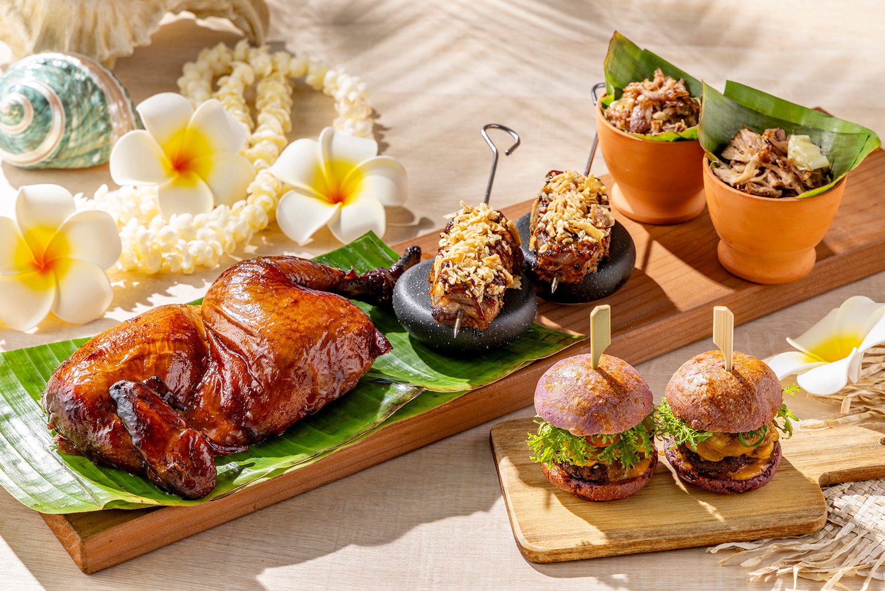 メインのグリル料理は桜の薪で芳ばしく焼き上げ、熱々のままテーブルへお届けします。丸ごと一羽の鶏をパイナップルと醤油ベースのソースで3日間漬け込み、炭火の熾火で燻し焼きにした「フリフリ・チキン」は、串に刺し回転させながら8時間をかけて焼き上げることで、外はパリッと、中は驚くほどジューシーな仕上がりに。ハワイアンシーソルトとガーリックでマリネした上質なビーフを炭火焼きにし、マウイオニオンと生姜のジェルソース、カリカリオニオンとともに味わう「プレフ・ステーキチップバイツ」、ハワイ語で“地中のかまどで焼く”を意味するカルアスタイルを、スモーク炉で再現した「カルアポーク&キャベツ」は、スモーキーな香りをまとったほろほろの豚肉に、直火でしんなり仕上げたキャベツとハワイアンレッドシーソルトを添えてお楽しみいただけます。