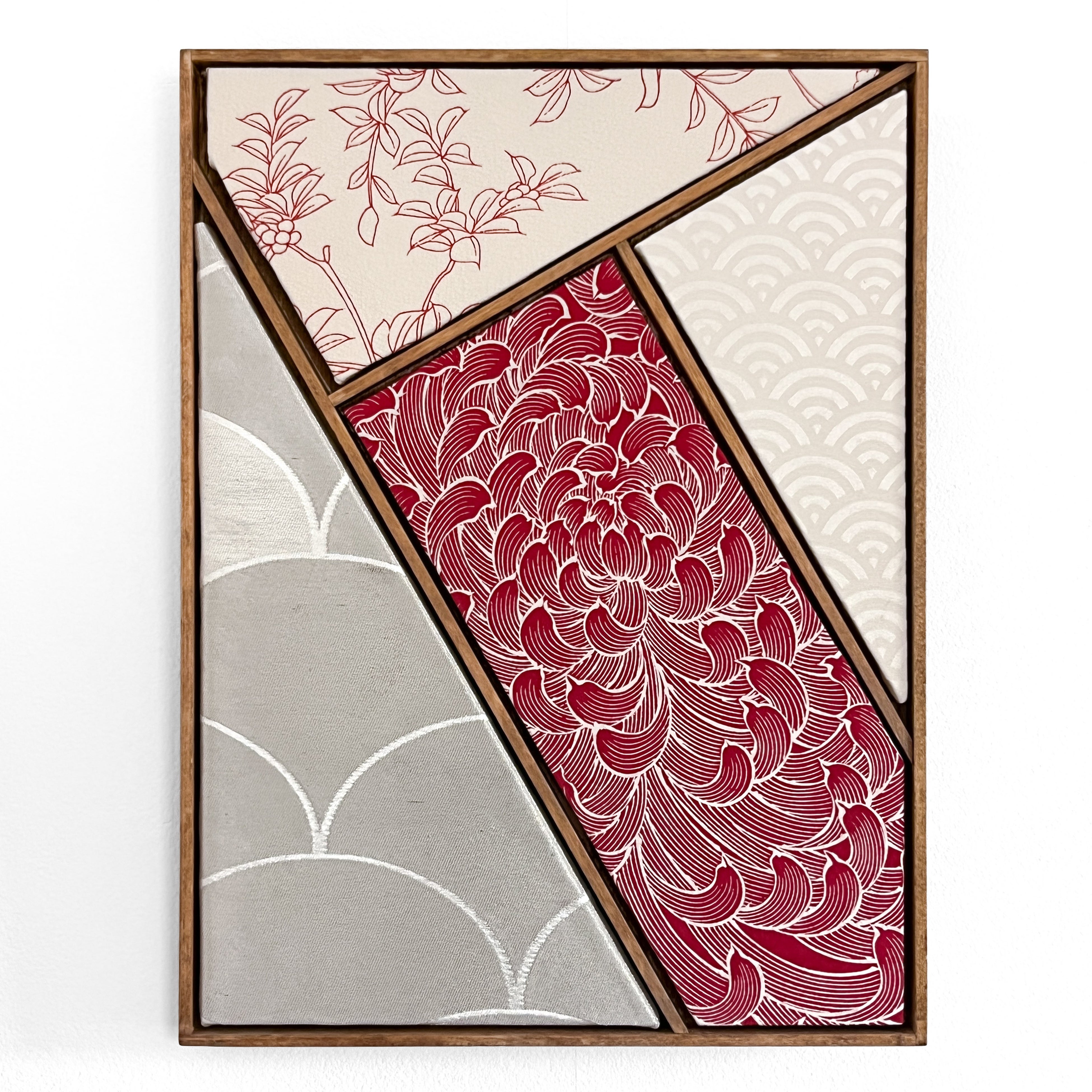 本展示では、当ホテル2階共用ラウンジの空間に着想を得て、「都市の夜ににじむ光と色彩」をテーマに制作された新作44点を含む計53点を展示。テキスタイルの繊細さと時間の層を重ね、静けさの中に宿る華やかさを、素材と色彩のレイヤーによって表現します。作品によっては、アンティークの桐たんすを額材として用いており、素材を余すことなく活かす表現も見どころの一つです。