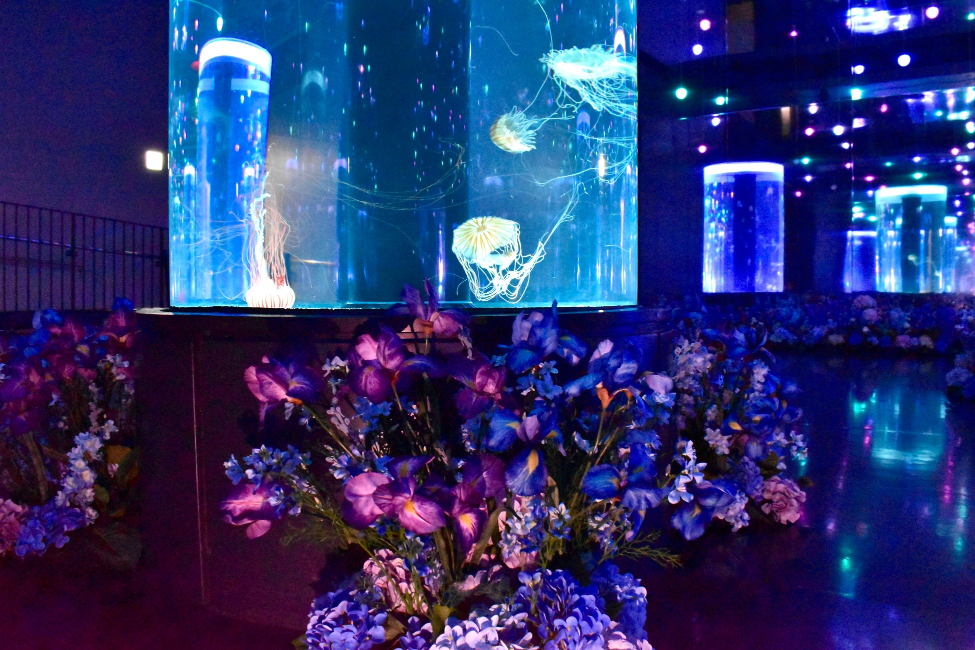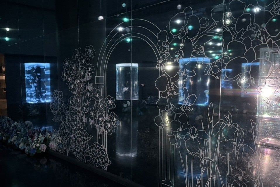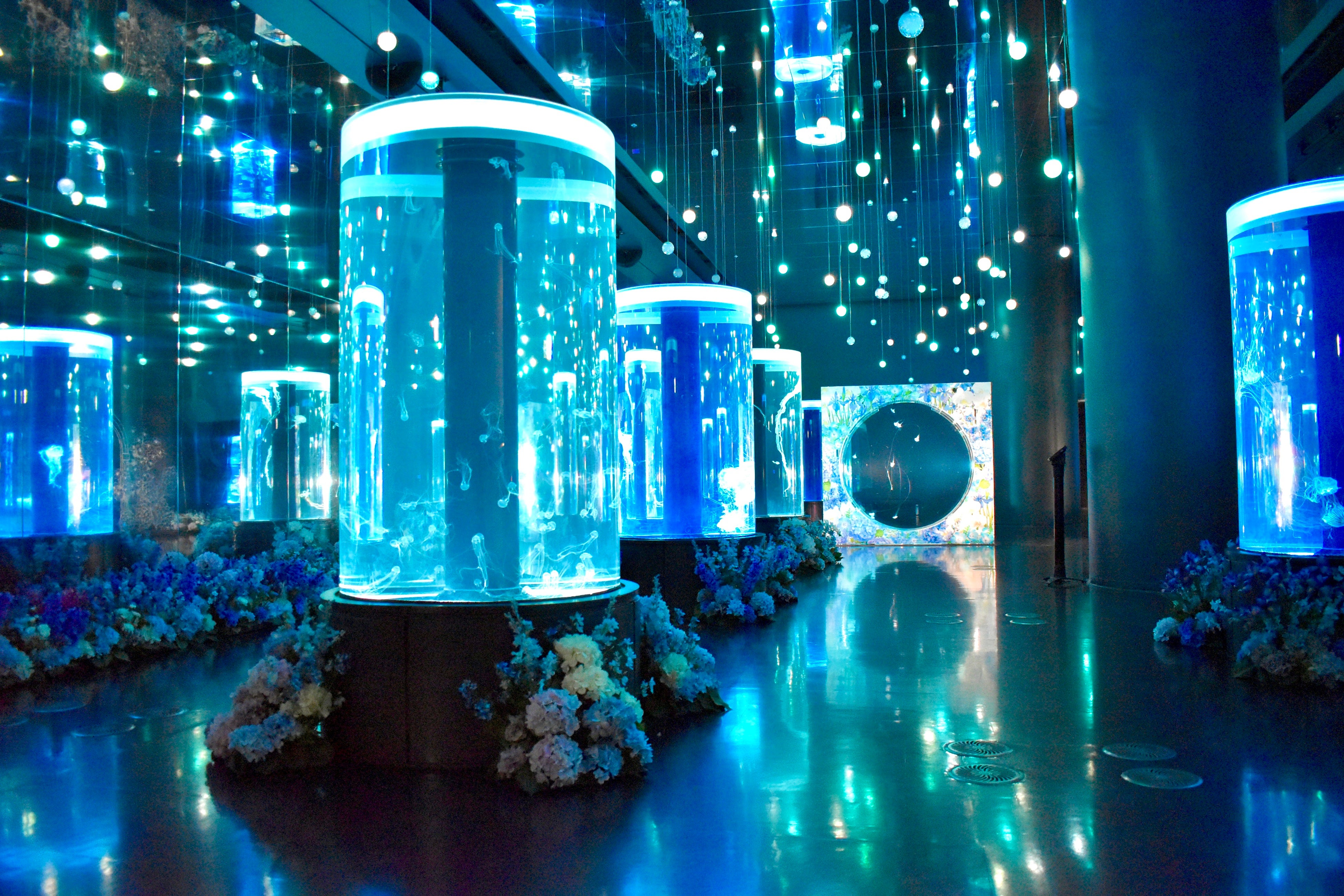 円柱型水槽の周囲には、クラゲの生態や特徴に親和性のある初夏の花々(アーティフィシャルフラワー)を配置。これらが鏡面や天井に幾重にも映り込むことで、花の空間がどこまでも続く無限の没入体験を創出します。