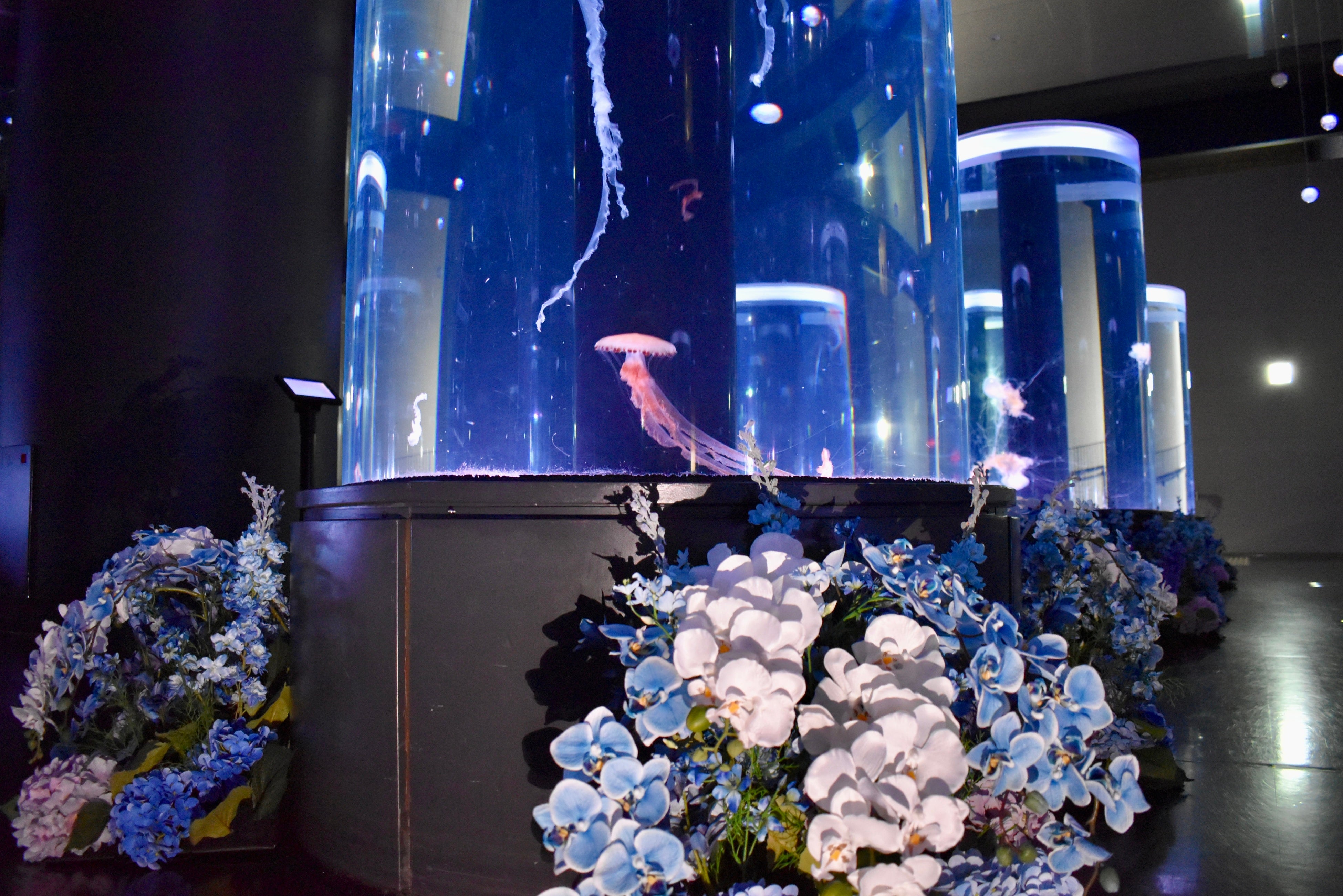 エリアの中央で象徴的な存在感を放つのは、ネモフィラを中心としたブルーやホワイトの花々をデザインした「象徴水槽」。水槽内には、成長に伴い傘や触手が青色になることからブルージェリーフィッシュとも呼ばれる、ゆらゆらと揺れるヒトダマクラゲが展示されています。