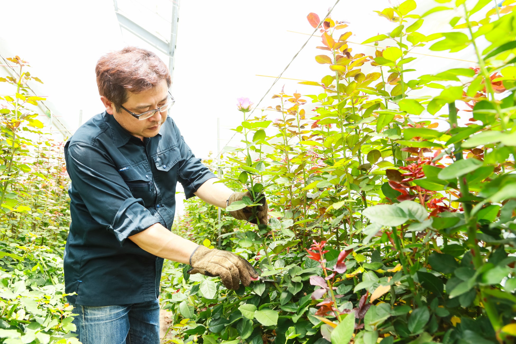 豊かな自然とびわ湖を有する湖国滋賀・竜王にて、1971年よりバラ栽培をスタート。先代が築き上げた技術と信念を受け継ぎ、花の姿の基本である「花・葉・茎」のバランスがとれた「三位一体のバラ」にこだわり丁寧に育てられております。また、世界的バラの育種家「デビッド・オースチン社のイングリッシュローズ」のカットローズ公式生産農場としてのライセンスを保有し、世界でも数名のライセンス農家として生産に取り組まれています。