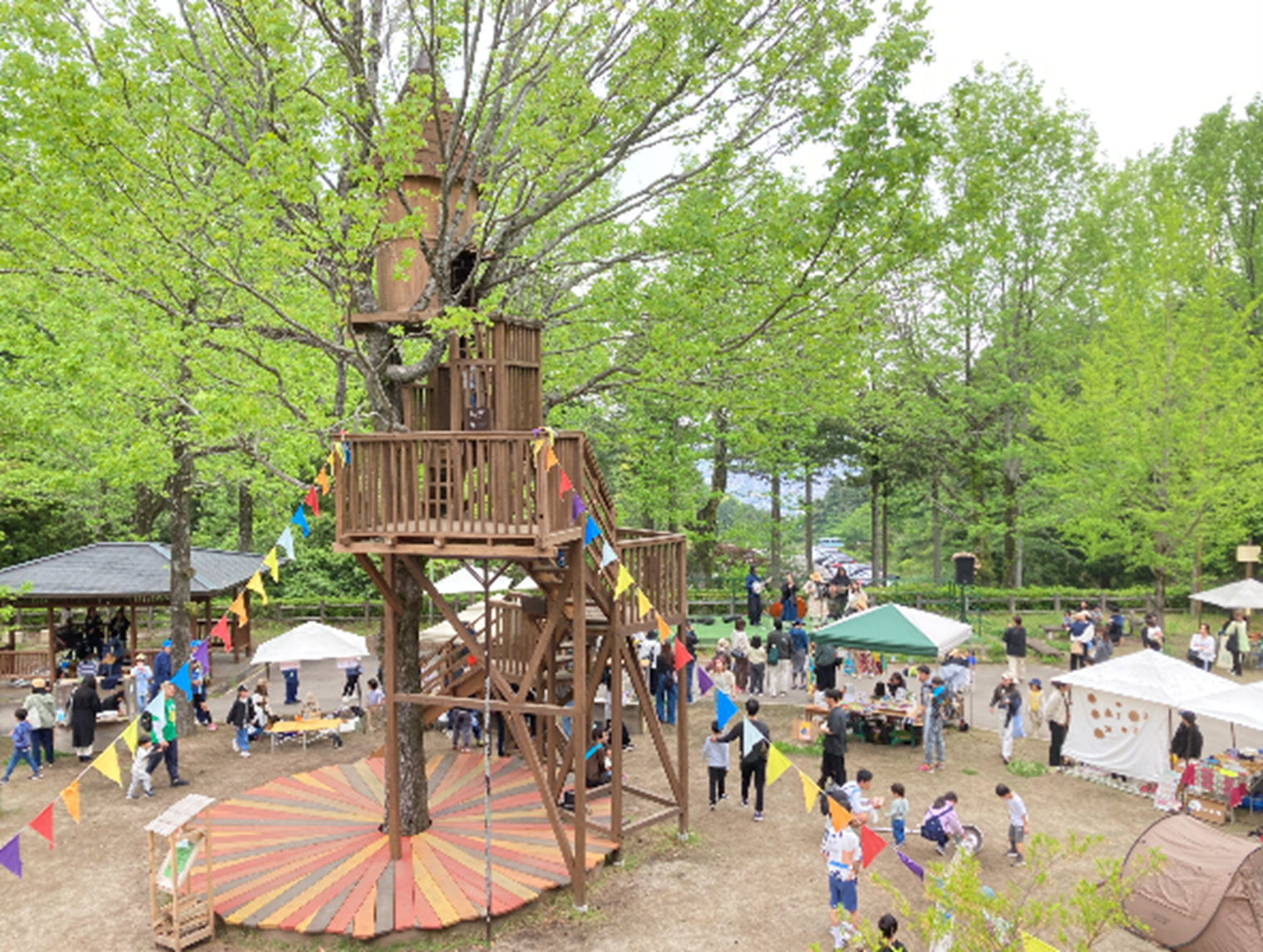 森の中の木々のように、参加した誰もが「つながり」を感じることができる『マザーツリーマーケット』を開催します。会場の森のひろばは、沢のせせらぎもほど近く、鳥のさえずりや草花を間近に感じられる森に囲まれた空間です。