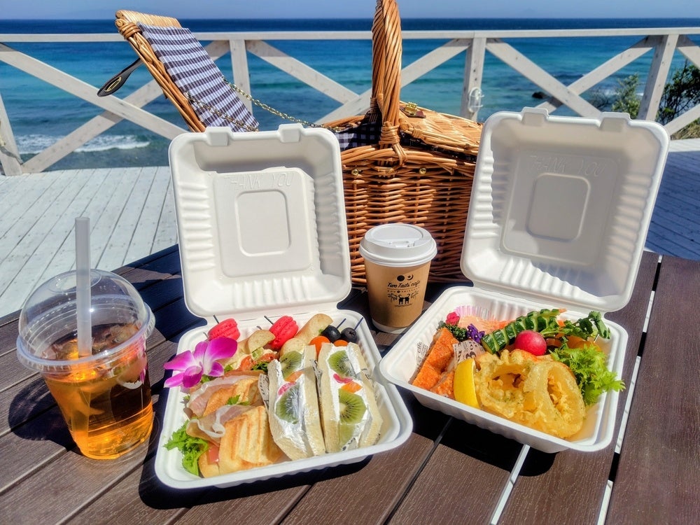 ・下田プリンスホテルならではの絶景を眺めながら、ピクニック気分を満喫しよう!ホテルの立地はビーチフロント、海の景色を独り占めしているような優越感に浸ることができます。テイクアウトBOXといっしょにピクニックセットを借りてお出掛けいただけます。