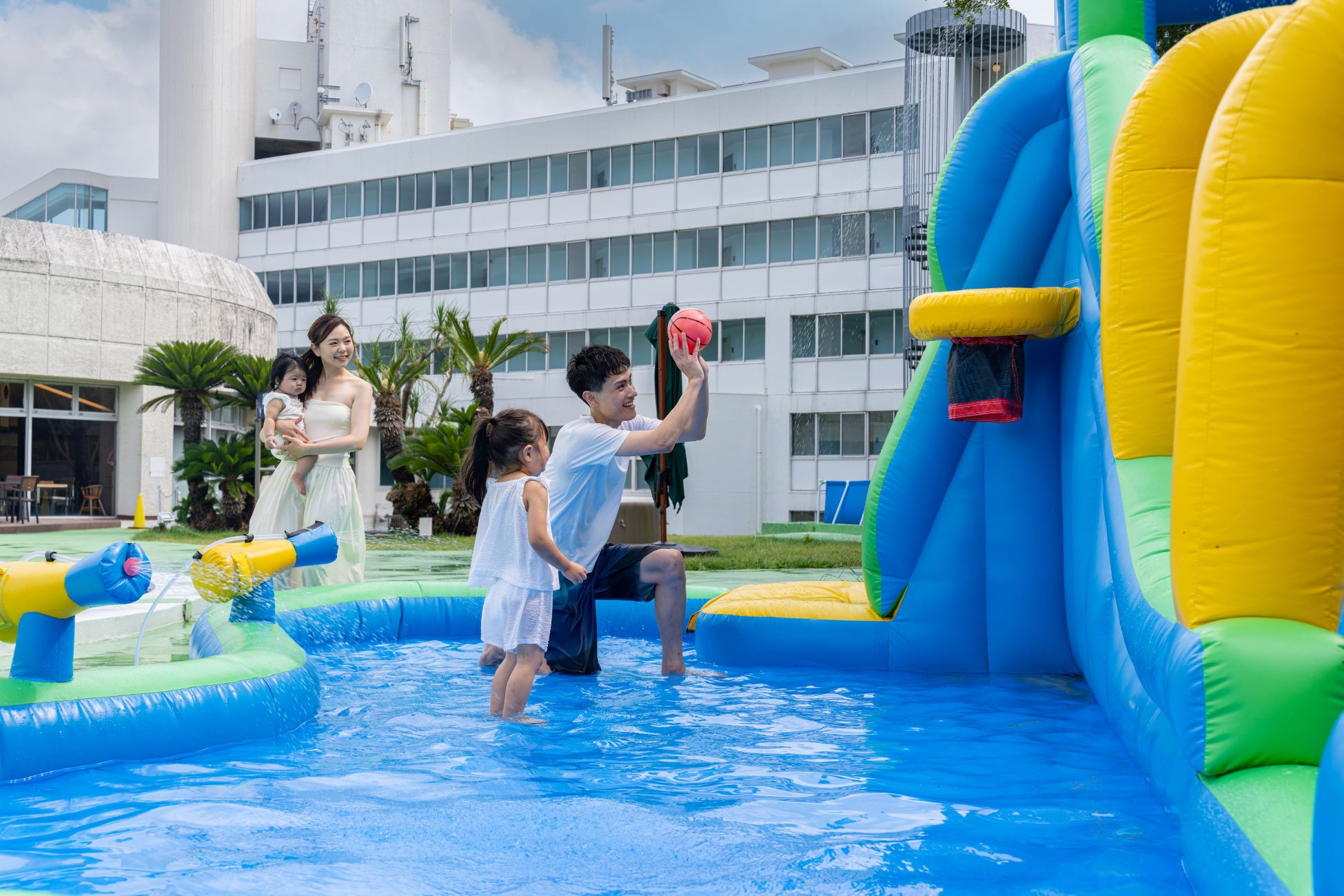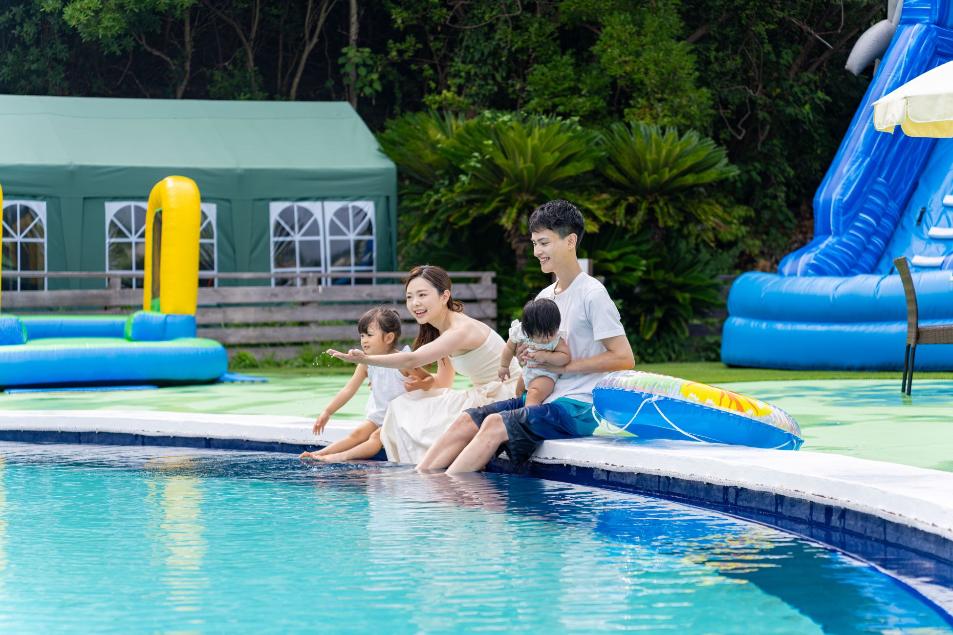 ・深さ120cmと60cmに区分けされ、小さなお子さま連れでも目の届きやすい直径12mの円形型プールです。滞在をより楽しめるようプールサイドにお子さま用のエアスライダーを2基設置いたします。