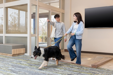 愛犬ファーストの設計により、館内では大浴場を除きリード着用での移動が可能。すれ違うお客様も愛犬家であるため、気兼ねなくお過ごしいただけます。すべてのわんちゃんが安心して楽しめる環境を整えています。