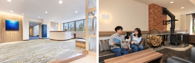 森の静けさの中にあって、時間ごとに変化する太陽の光が建物と自然の表情を豊かに彩るホテルで、愛犬とのひとときをおくつろぎください。