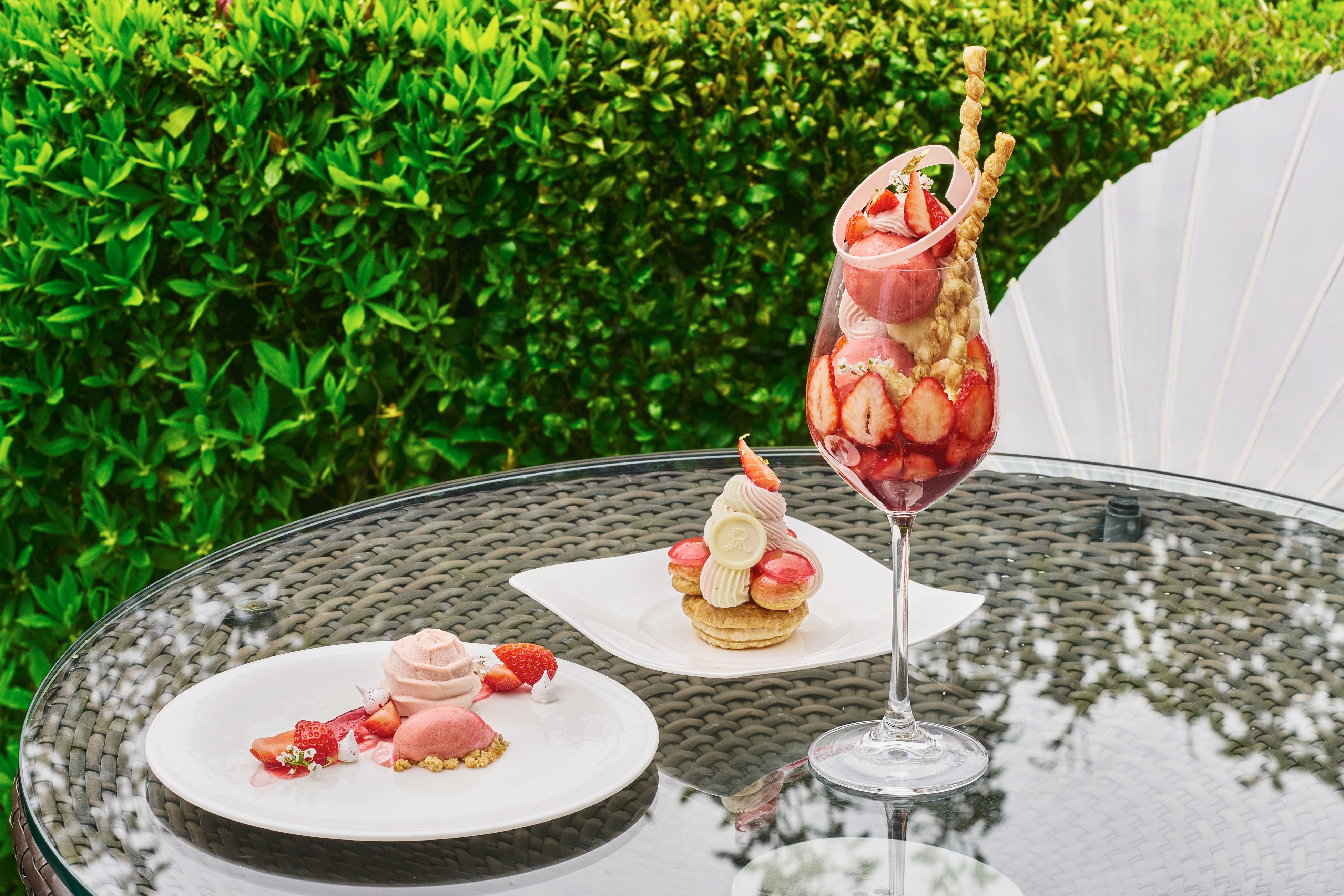 スイーツには、エグゼクティブペストリーシェフ 桑原 涼介 による、繊細かつ華麗なデザートをご用意。苺を贅沢にあしらったパフェは、果実の瑞々しさと軽やかなクリームが重なり、春らしい爽やかさを印象づけます。苺と桜のサントノーレは、可憐なフォルムとともにやさしい香りが広がり、ローズムースのアシェットデセールは、花の香りと酸味が重なり合い、芳醇な味わいを引き立てます。