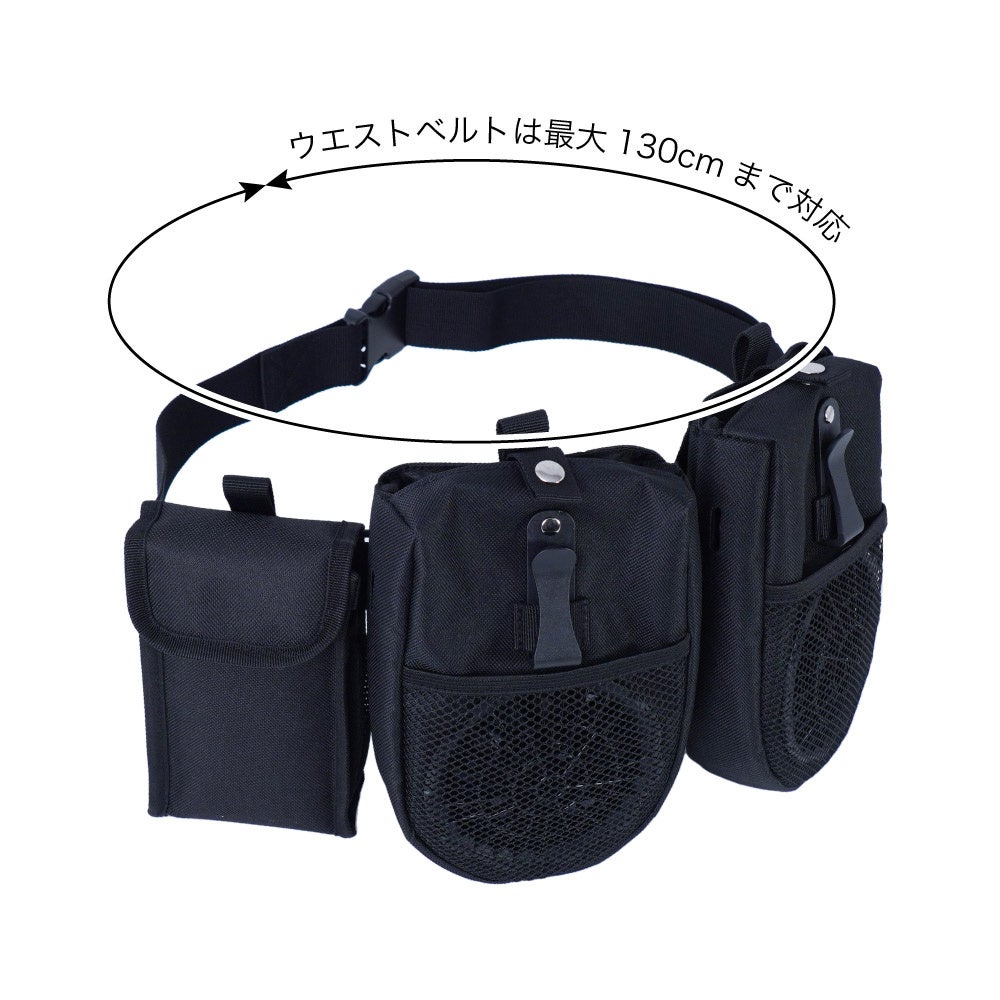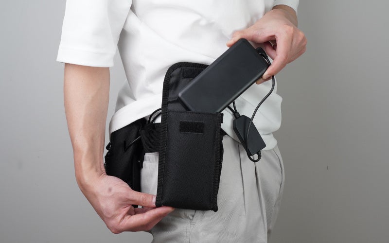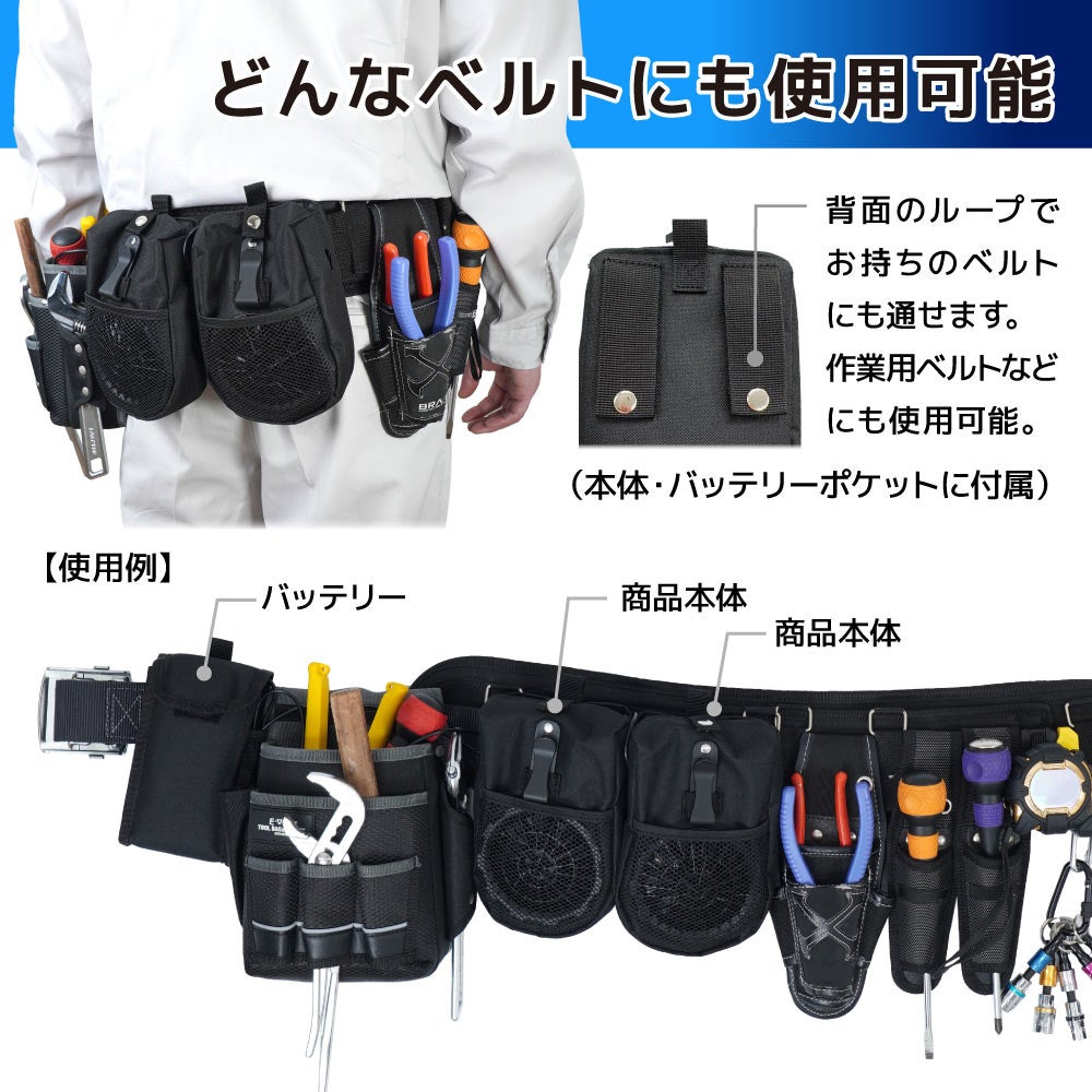 本体・バッテリーポケットは手持ちのベルト(幅6cm程度まで)につけて使用することも可能。