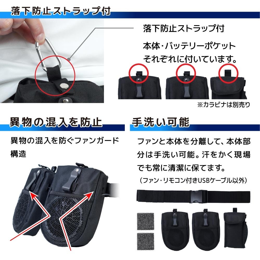 ・セット内容/本体、ファン×2、バッテリーポケット、ベルト、リモコン付きUSBケーブル、 ウレタンスペーサー×2、日本語取扱説明書