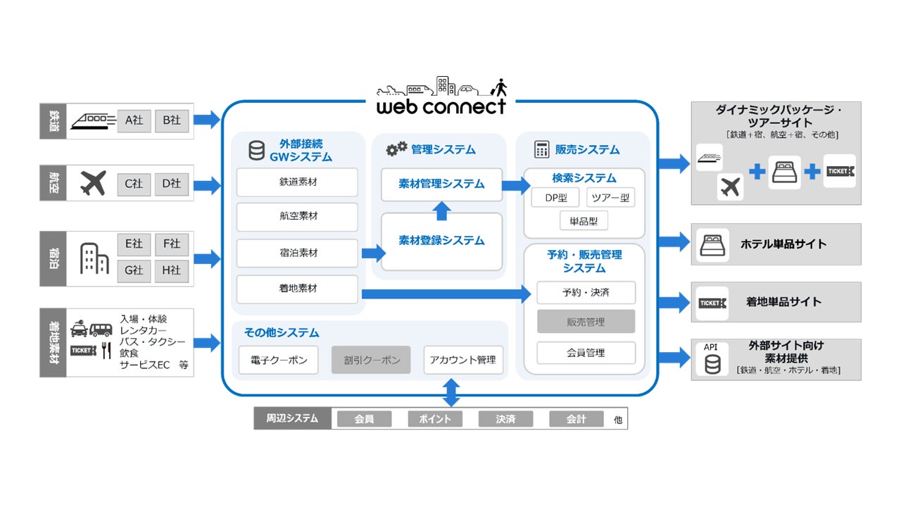 2025年5月に「webコネクト」を活用して先行リリースした航空ダイナミックパッケージ(以下、航空DP)に続き、2026年4月8日より新たに「JRダイナミックパッケージ(以下、JRDP)販売機能」、「着地観光素材(観光・体験などの現地体験)販売機能」の提供を開始しました。これにより、交通手段や宿泊施設などを自由自在に組み合わせた「ツアー型商品」の造成・販売が可能となり、大幅な機能拡充が実現しました。
