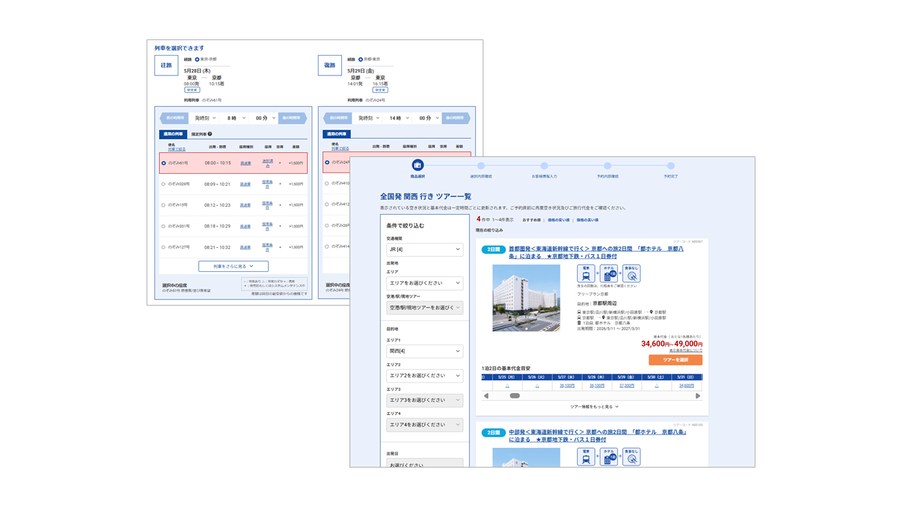 2. JR商材の機能強化と多様な旅程への対応直観的なUI/UXによる操作性向上:JRDPにおいて、webコネクトの特長である「列車・施設同時選択」が可能となるUIを採用しました。ユーザーは少ないステップで直観的に予約を完了できます。 商品ラインナップの拡大:後述する「ツアー商品管理機能」により、従来のシステムでは対応が難しかった「日帰りJR商品」など、柔軟で多様な商品パターンの提供が可能になりました。