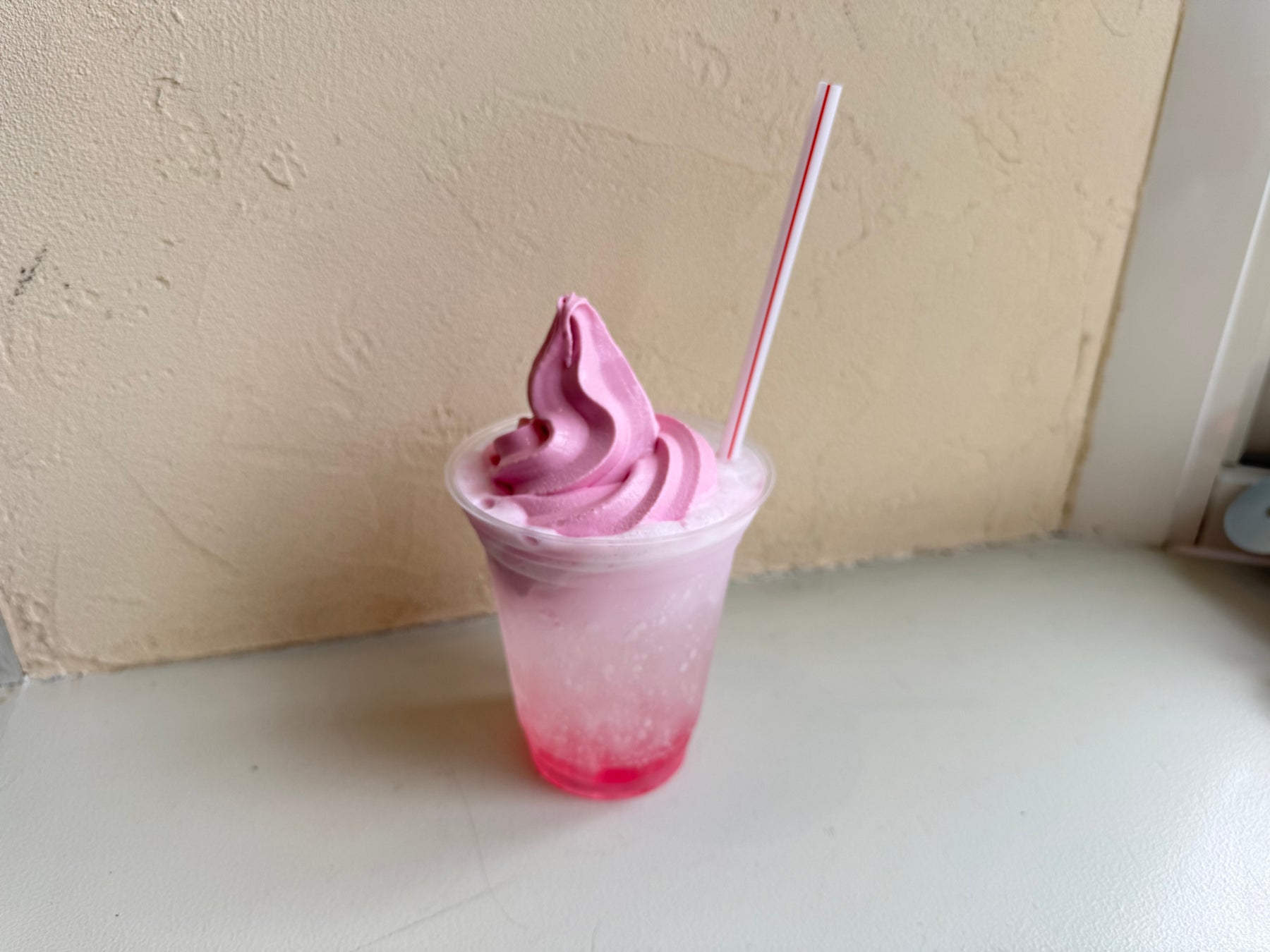 ➀商品内容 ローズソーダに鮮やかなピンク色のバラソフトをのせたバラを満喫できるフロートです。