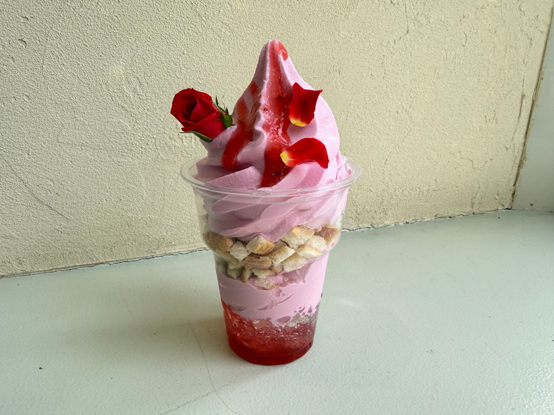 ➀商品内容 バラのソフトクリームに食べれるバラ、ベリーソース、サクサクのラスクにキラキラ輝くクラッシュゼリーが楽しめる、この時期だけの特別な商品です。