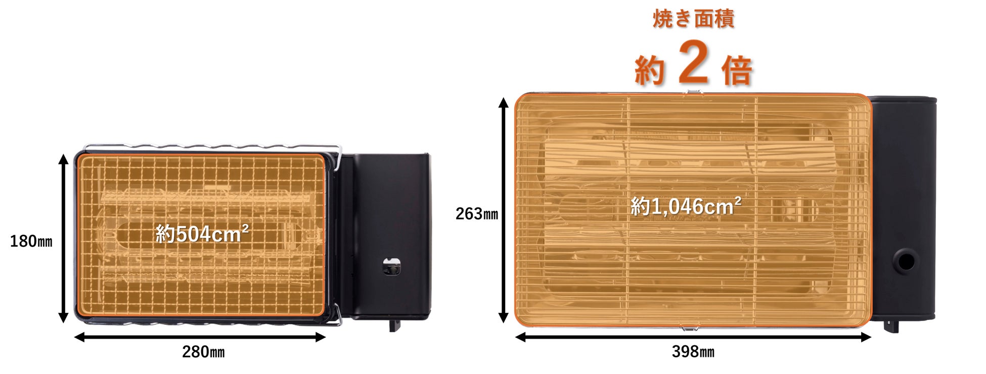 従来品「カセットガス炉ばた焼器“炙りやⅡ”」と比較して、焼き面積は約2倍。大きな海鮮や野菜、串焼きなどをゆったりと並べられます。ご家族での食事や大人数でのパーティーでもお楽しみいただけます。