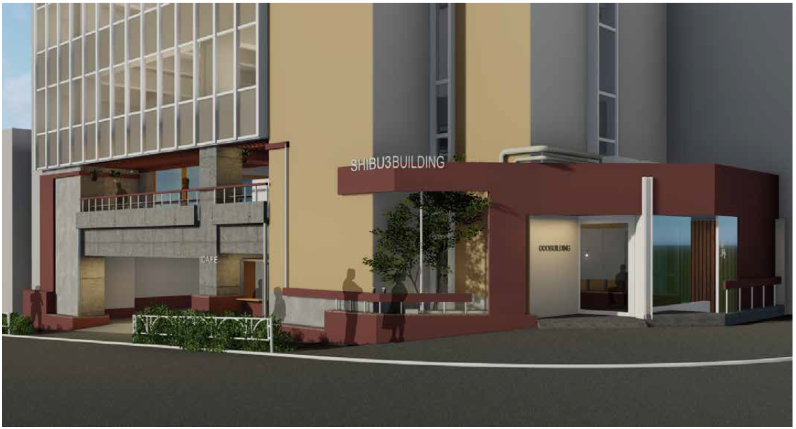 渋谷三丁目(仮称)ビルは築51年の築古ビルのリノベーションによる、コンパクトなオフィスの提供や金王八幡宮の参道に開かれたカフェ機能の導入を通じて再生し、当地区のまちづくりの将来像であるIT系企業の集積や魅力的な歩行空間の形成を推進する事業で、2026年12月の竣工を目指しています。