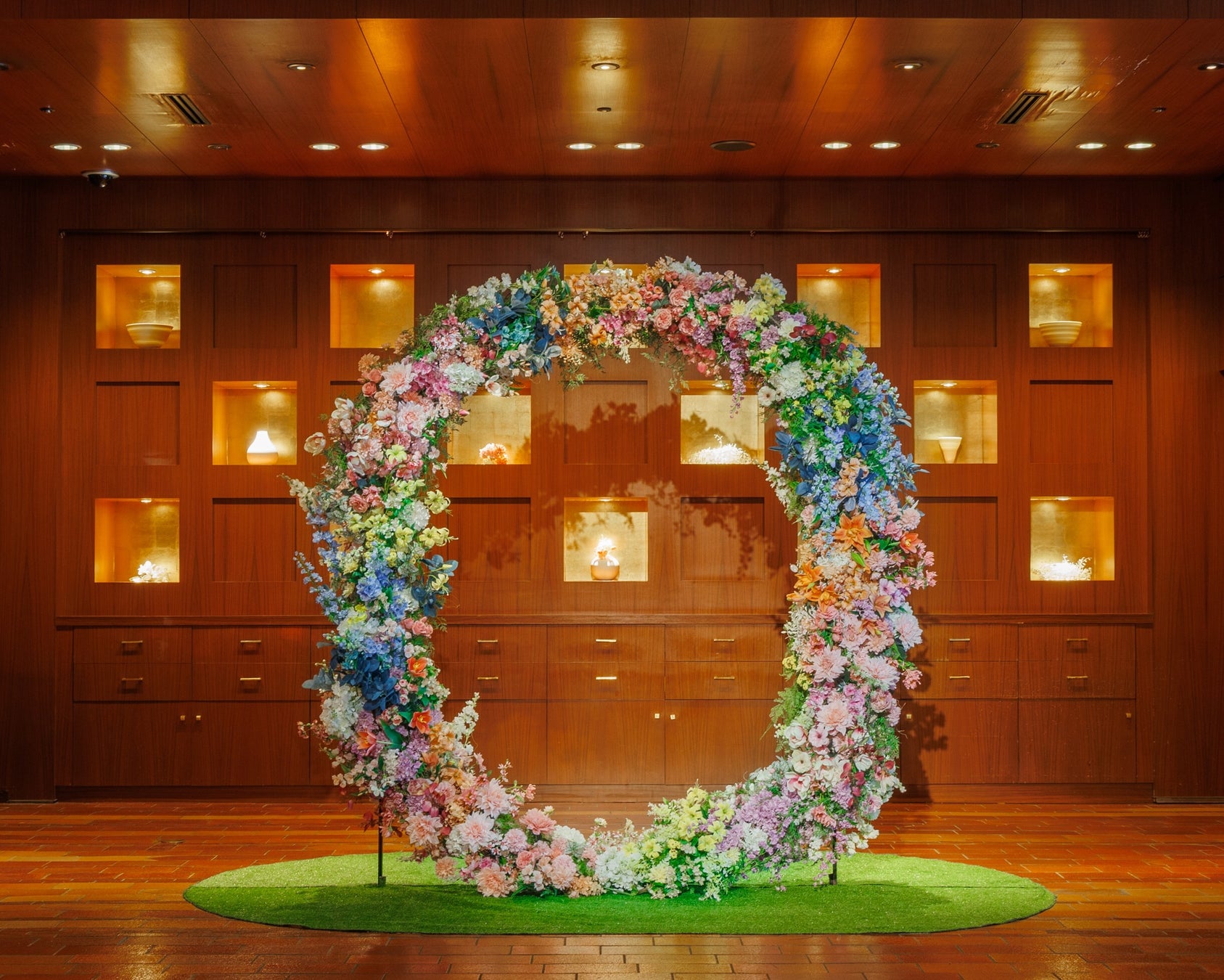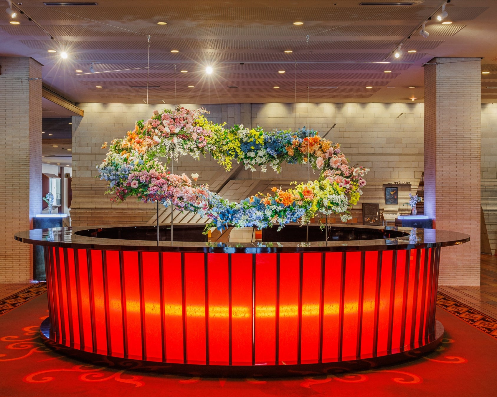 名古屋観光ホテルのロビーでは現在、「澄みわたり、満ち、未来へ蒔く」をテーマに、春から初夏へと移ろう繊細な時間の流れが、季節の花々とやわらかな色彩で表現されています。