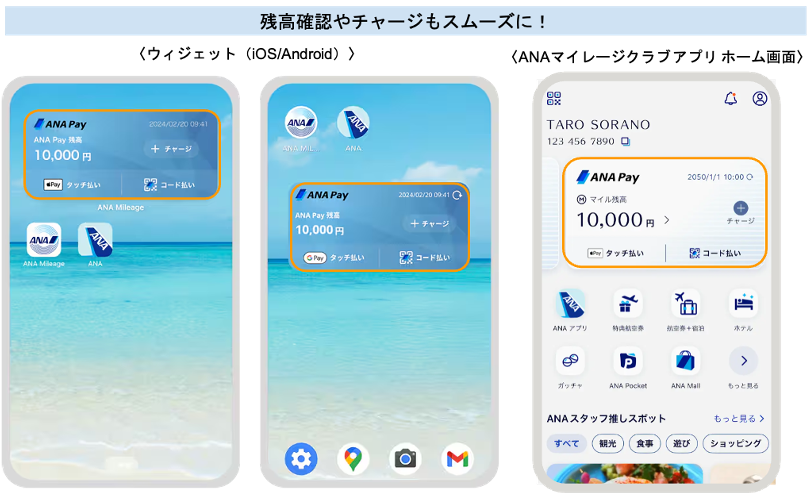 スマートフォン ホーム画面のウィジェットに対応。アプリを開かず、「もっと素早く残高を確認したい」という声に応え、スマートフォンのホーム画面から即座に残高確認やコード表示ができるウィジェット機能を搭載しました。また、ANAマイレージクラブ アプリのホーム画面からもANA Payの残高確認やチャージが直接操作可能になりました。