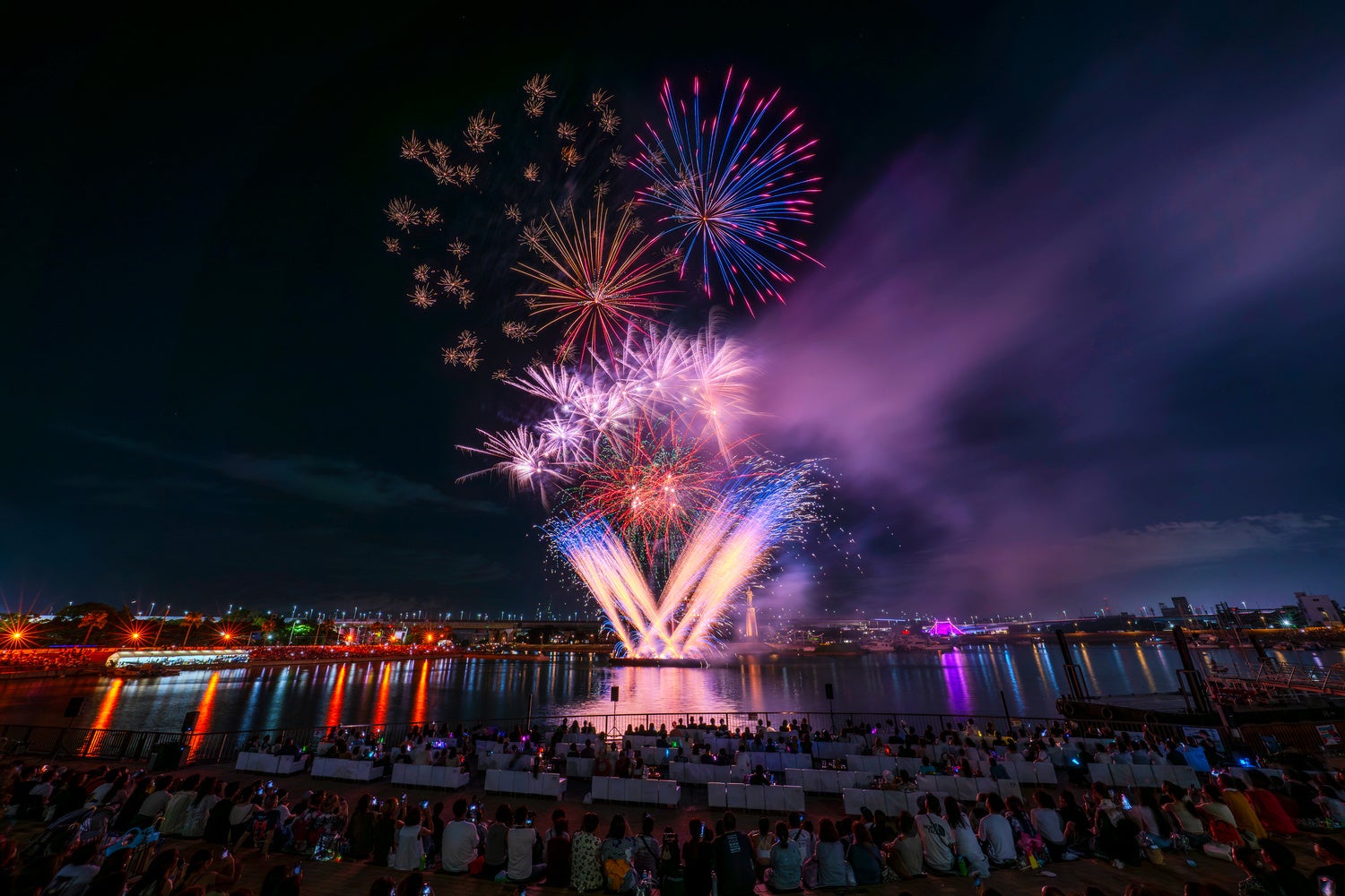 コの字に囲われた堺旧港の中央から打ち上げられる花火は、どのお席から見ても驚くほど間近で大迫力な演出をお楽しみ頂けます。至近距離から打ち上るスターマインによる華やかな演出をはじめ、仕掛け花火による多彩な演出は観客を魅了します。音楽に合わせたリズミカル且つダイナミックな演出の打上花火は、まるでライブのような臨場感をお楽しみ頂けます。